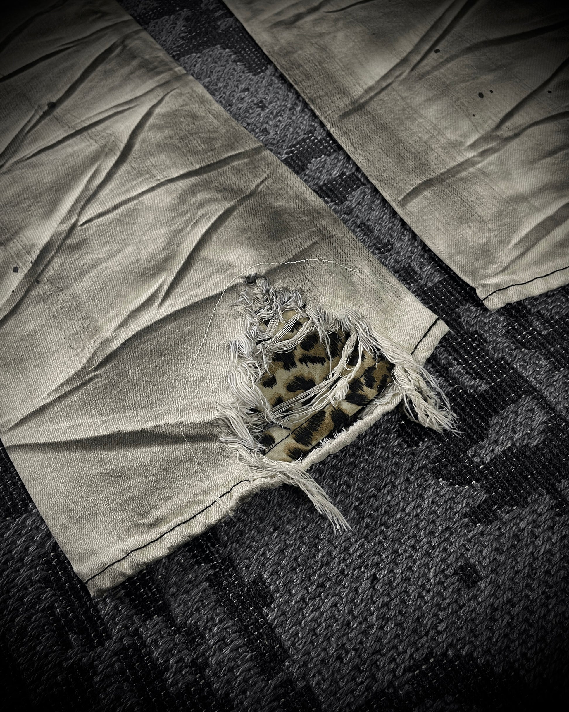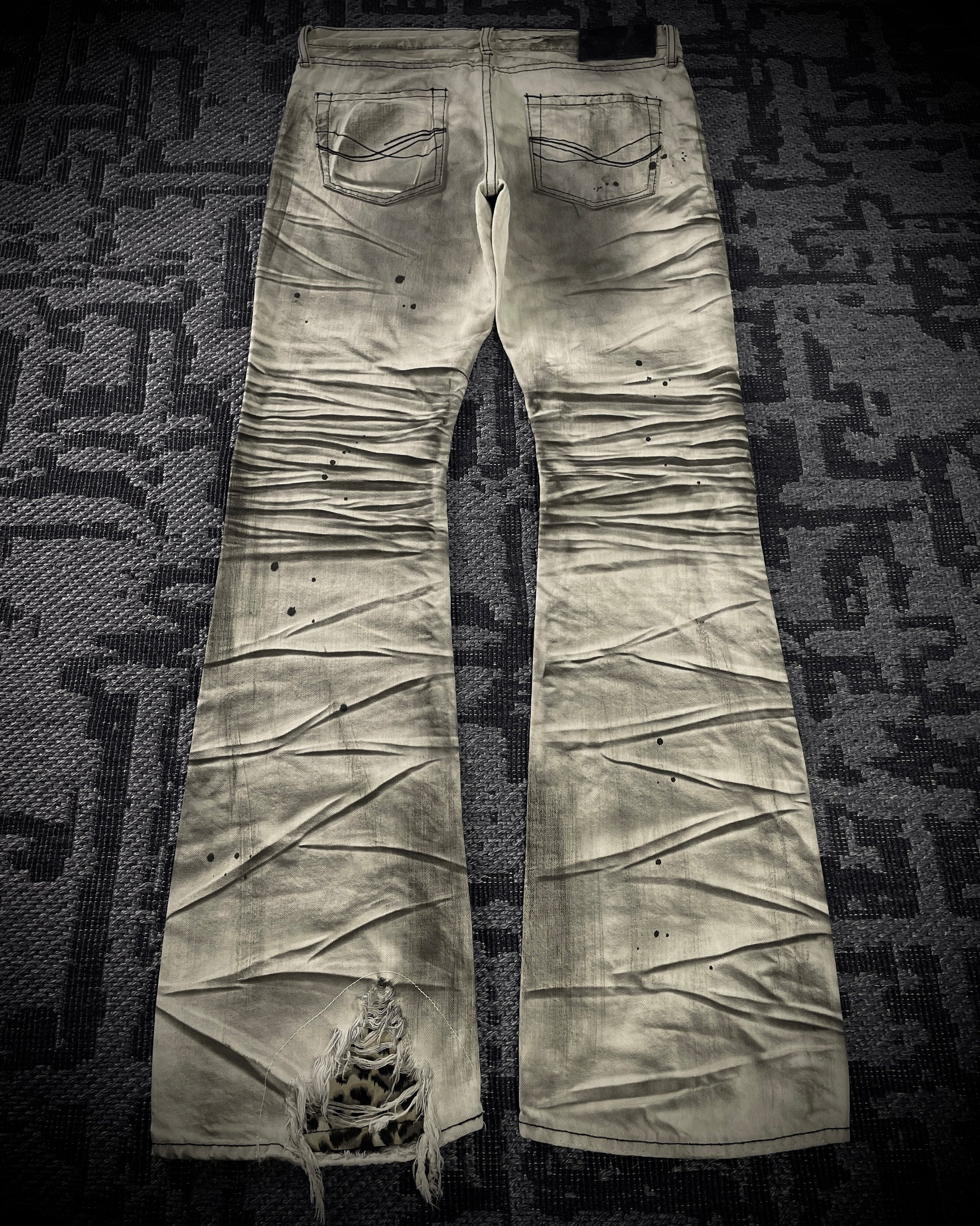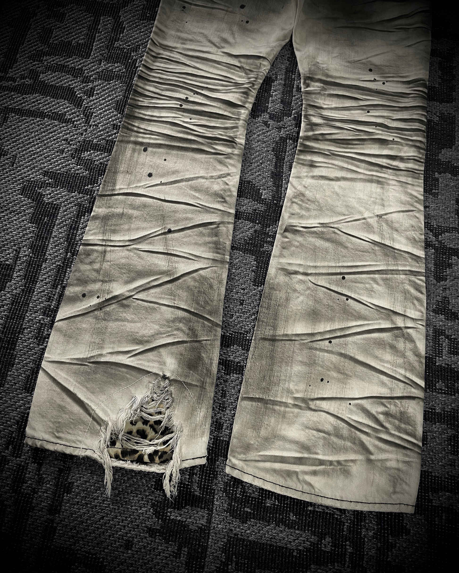 These CavariA jeans feature clawmask bleaching and multi-point paint splatter detailing, with leopard patterns at the knees and back hem, studded pocket edges, and a chain hook—crafted in a bold flared silhouette that merges artisan technique with striking design.