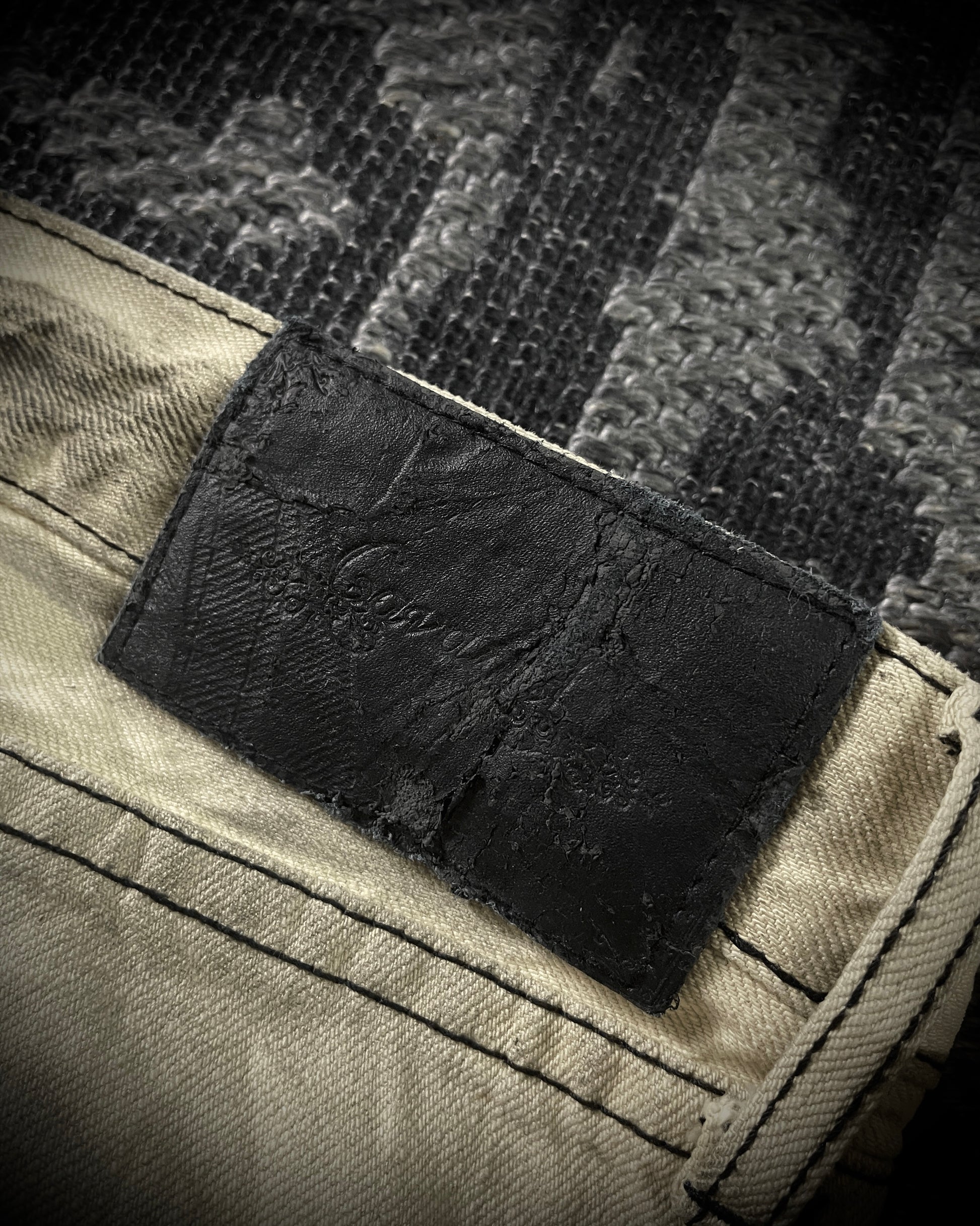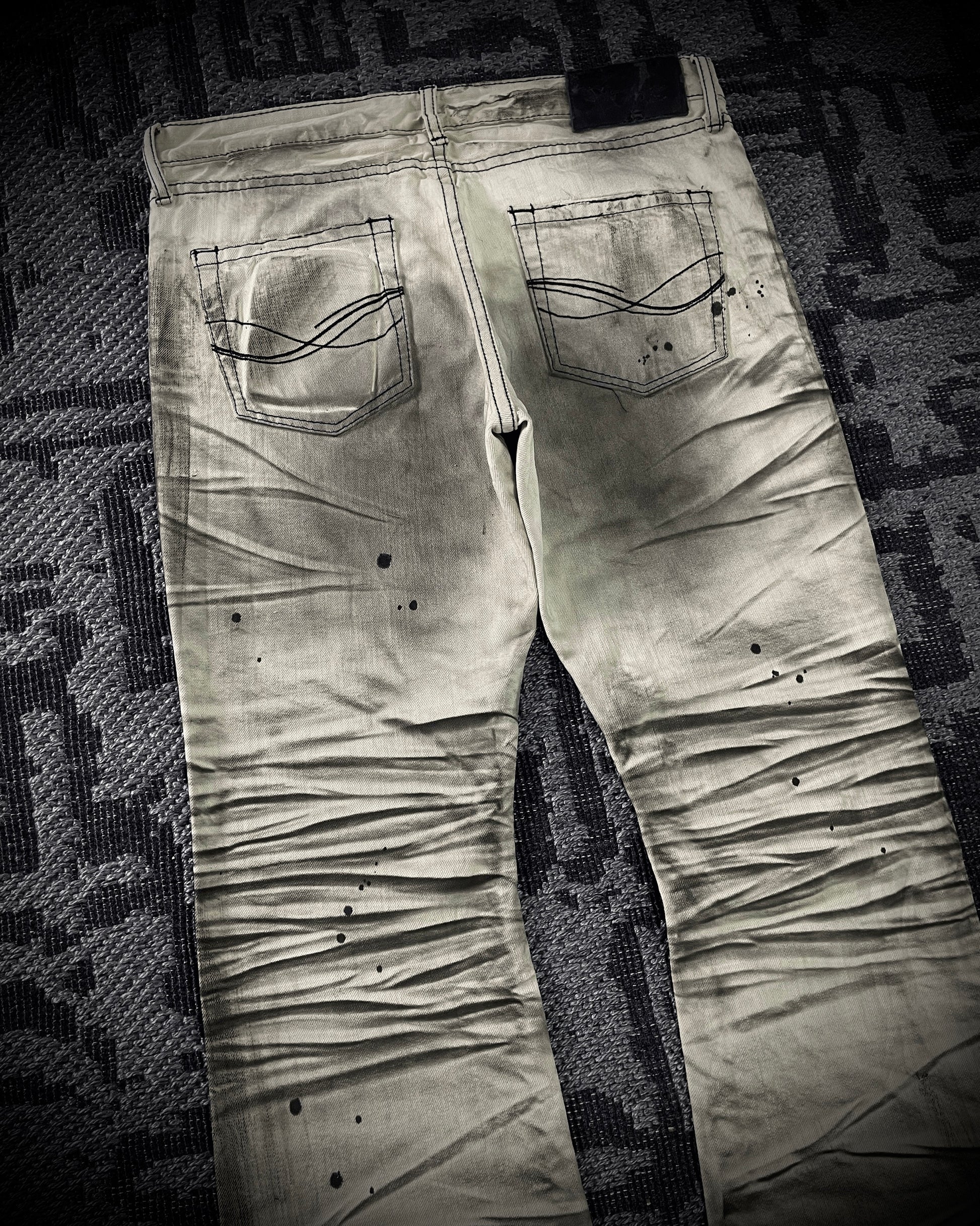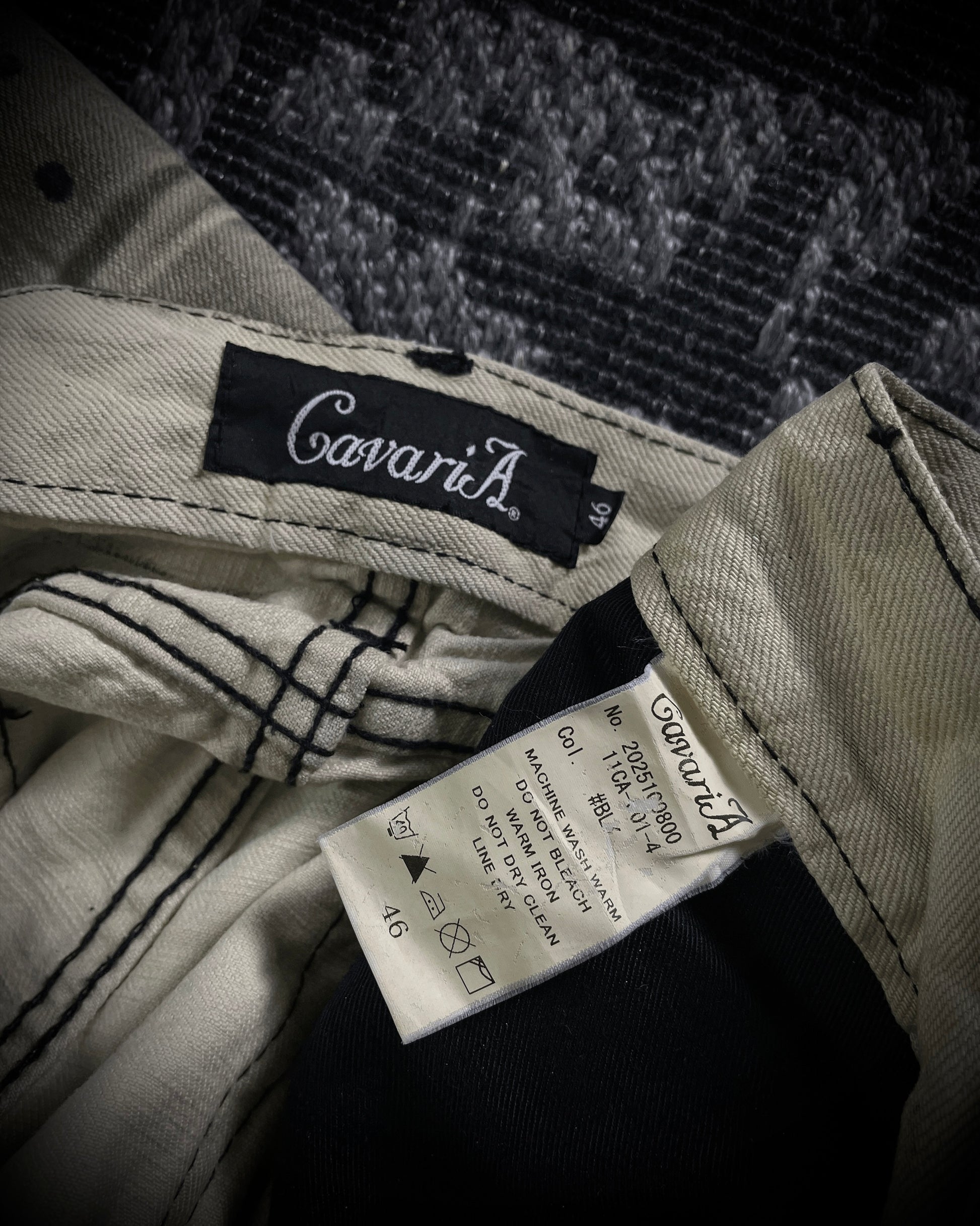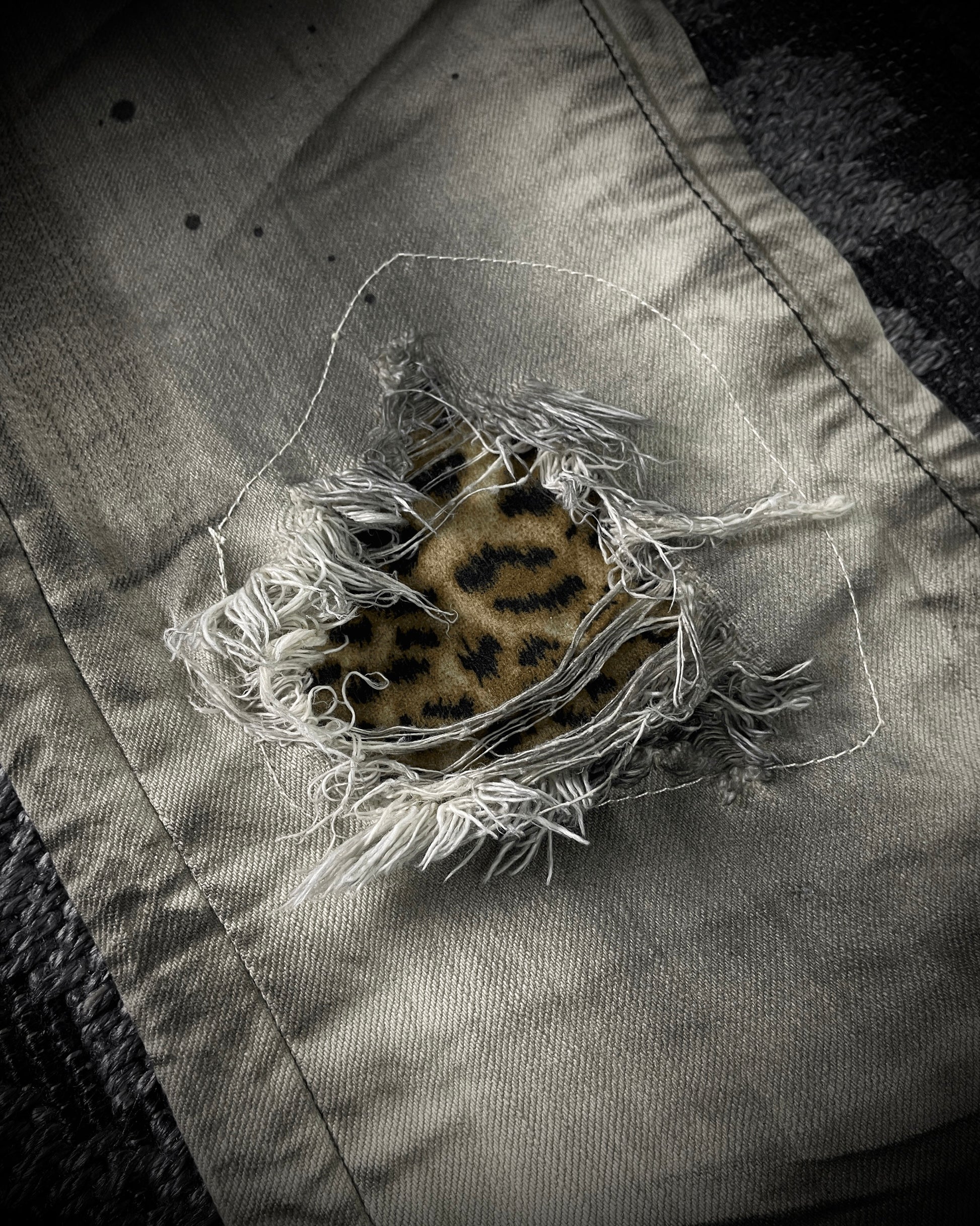 These CavariA jeans feature clawmask bleaching and multi-point paint splatter detailing, with leopard patterns at the knees and back hem, studded pocket edges, and a chain hook—crafted in a bold flared silhouette that merges artisan technique with striking design.