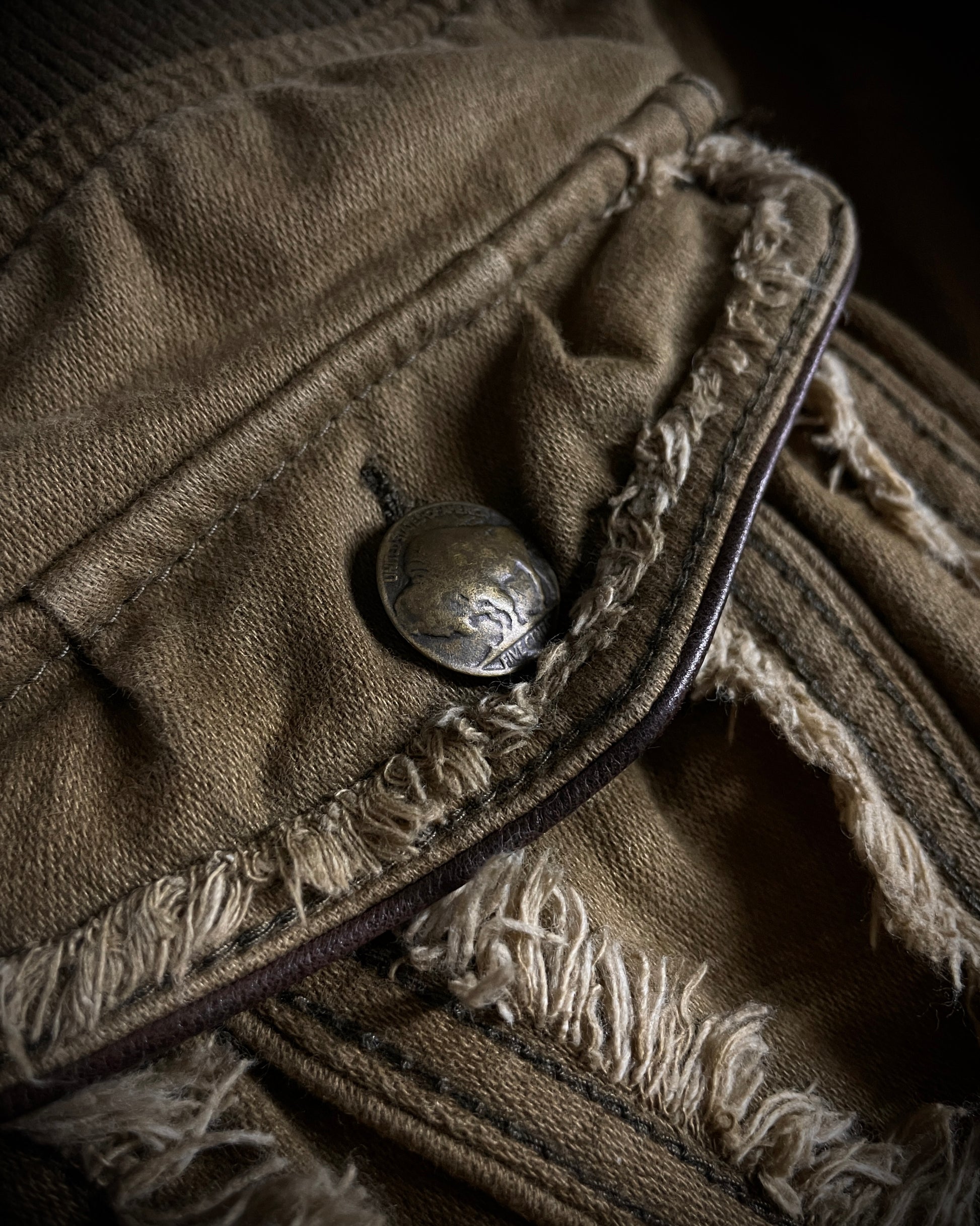 These flared cargo sweatpants from G.O.A, found in the 2000s, have short fur around every pocket and buttons featuring the buffalo design from the U.S. five-cent coin. The waist adjusts freely, and it fits best around 32–34 inches. The leg openings can be widened up to 12.5 inches for extra comfort.