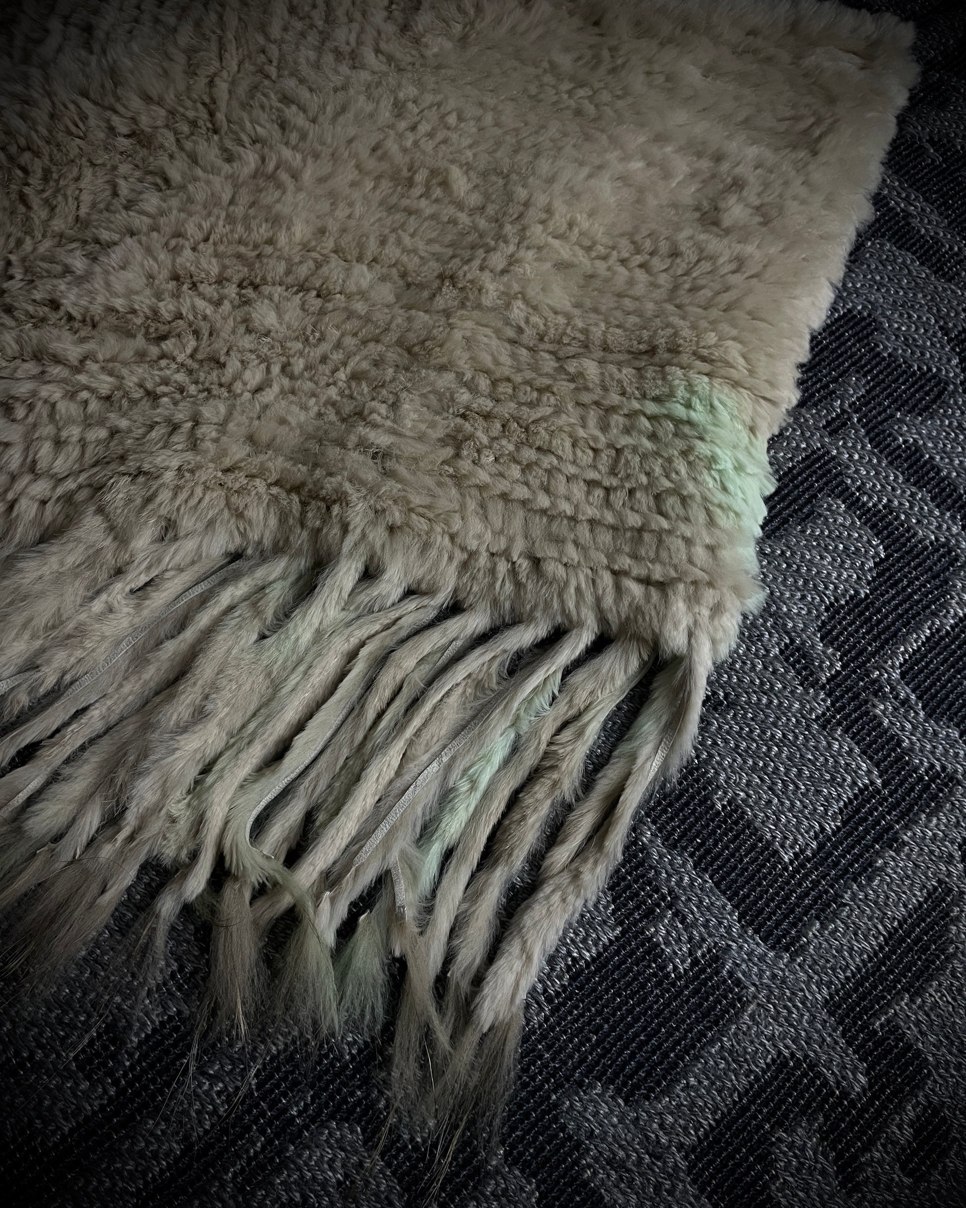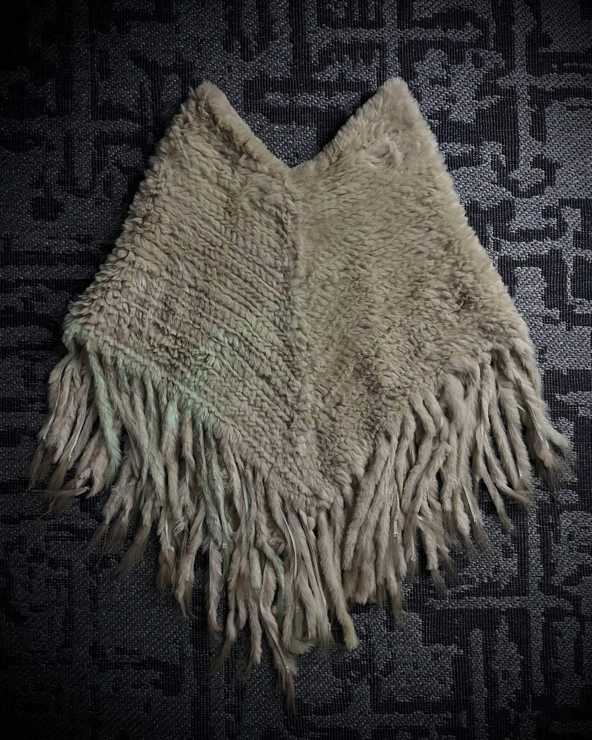 GOA rabbit-fur poncho with tassels. There are areas where the rabbit fur has faded to a green tone, as shown in the photos. The fur remains soft and does not affect wear.