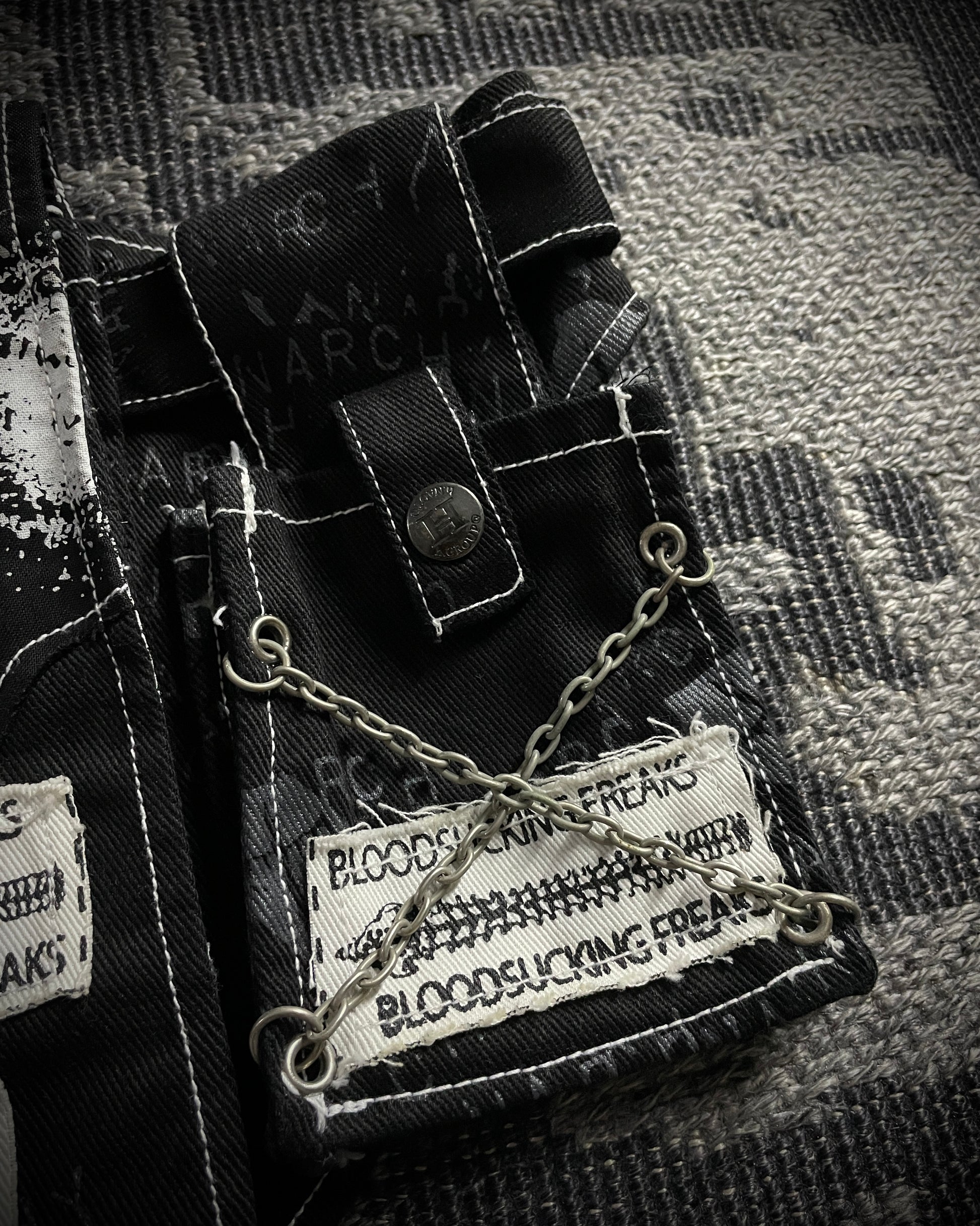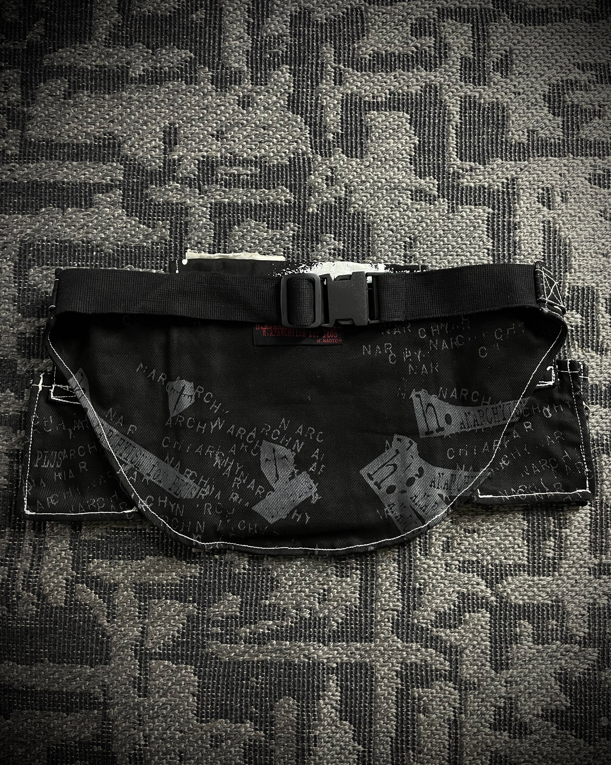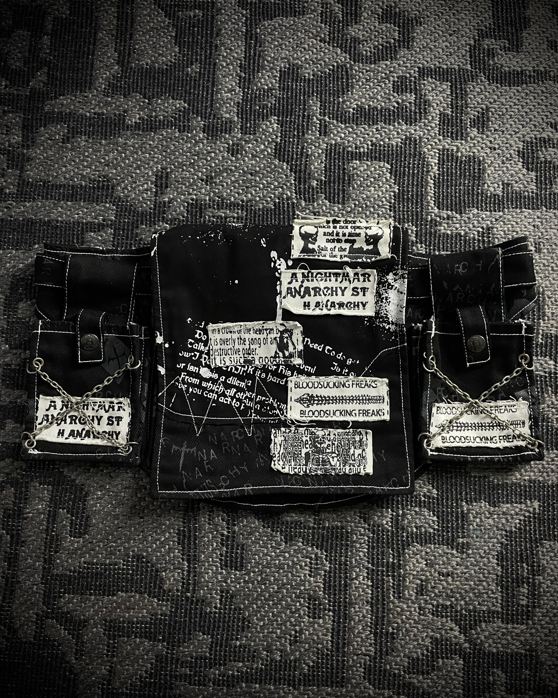 Founded in 1997, H.Naoto is a pioneering Japanese fashion brand known for its dark, avant-garde designs that fuse gothic, punk, and visual kei aesthetics. The “H.Anarchyism for PLUS” belt bag continues this legacy, crafted from black canvas and layered with multiple patches and prints. Featuring chains and mixed-font lettering, it also showcases printed details on both the interior and back, giving it a unique, rarely seen character. The bag has one main compartment and two smaller pockets, with an adjustable strap fitting waists up to 33 inches.