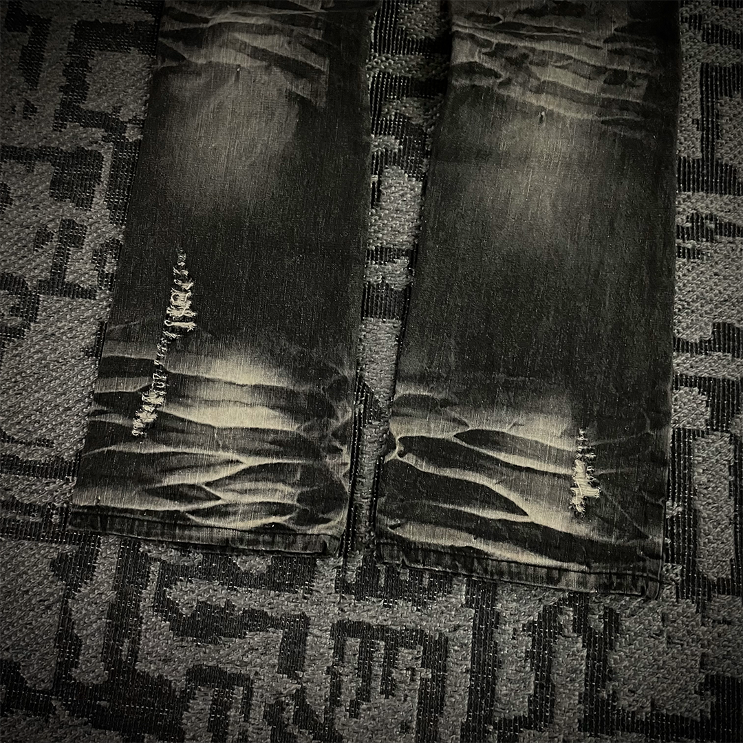 This pair of low box bootcut jeans features a double waist, heavy wash, ripped details, and a studded waistband with distressed inner sections.