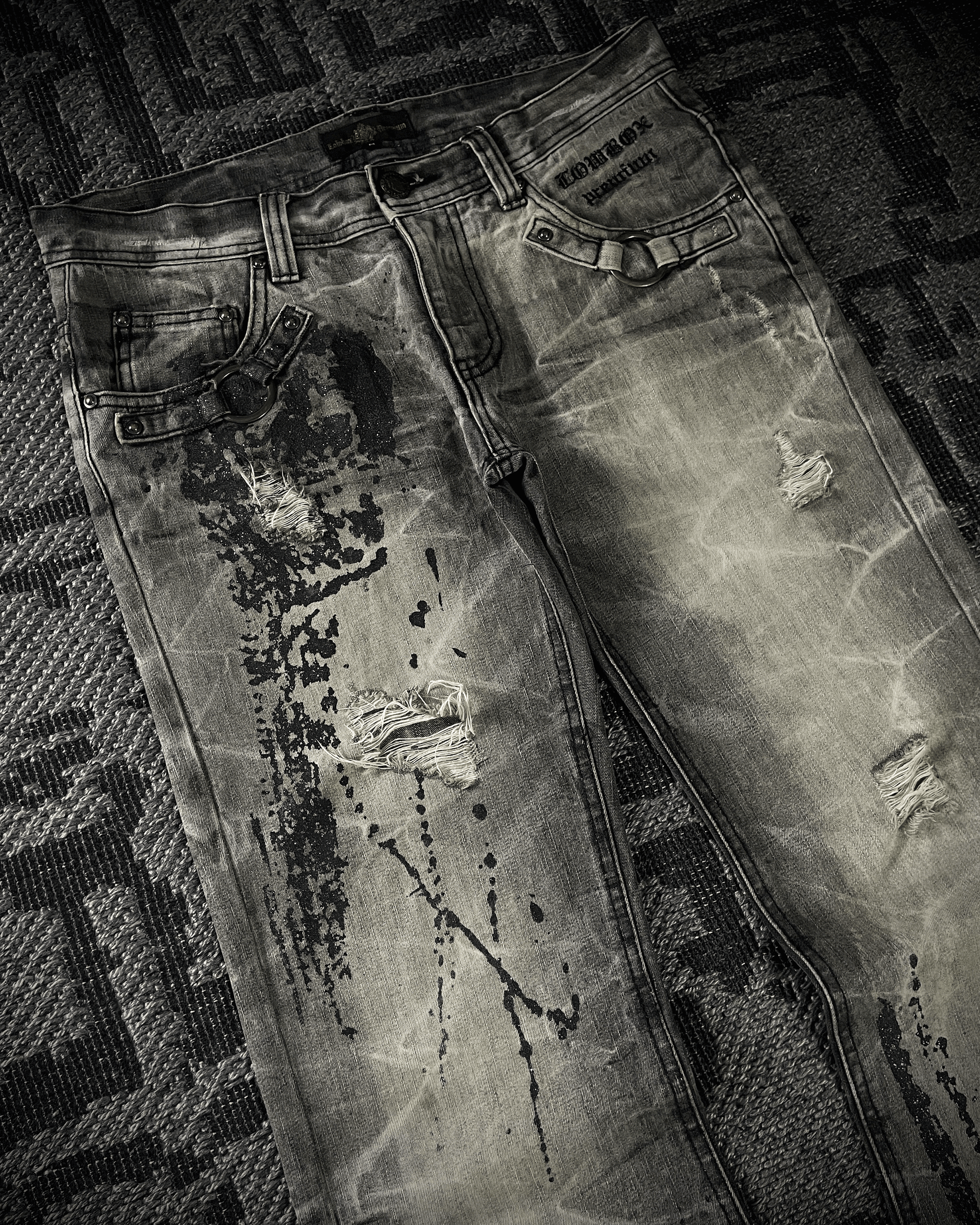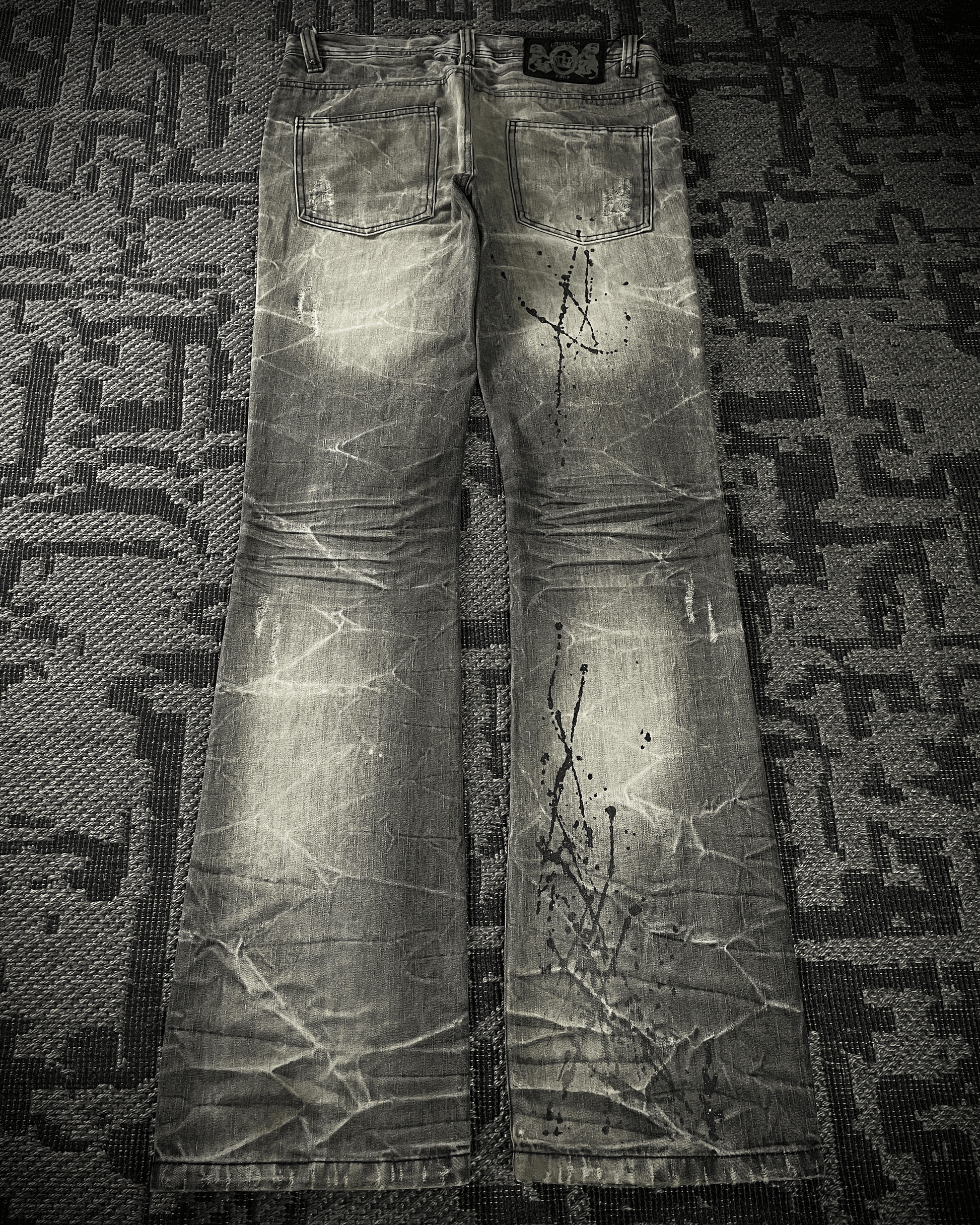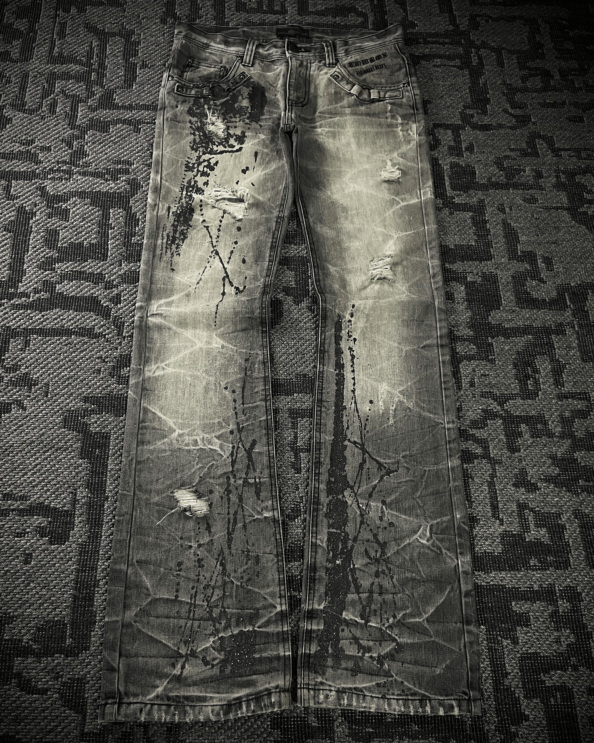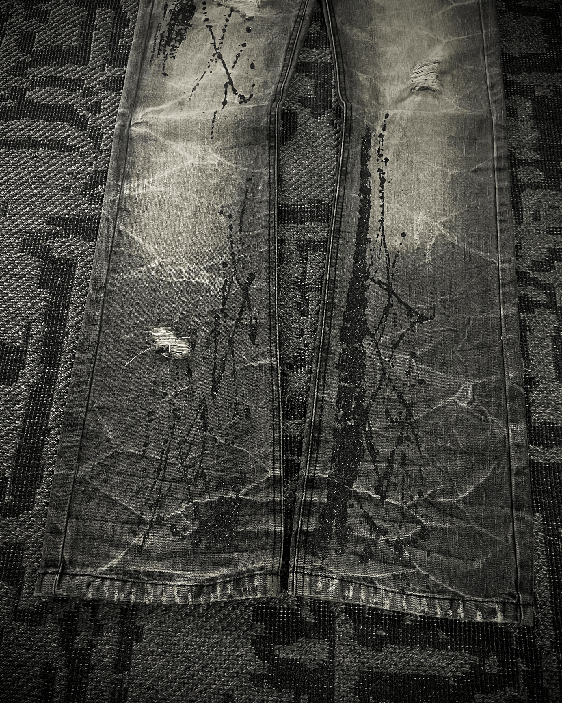 Lowbox denim jeans featuring black paint splashes highlighted with glitter detailing, creating a bold contrast against the acid-wash base. Finished with deliberate distressing and cut in a fitted bootcut silhouette, embodying a raw yet refined underground aesthetic.