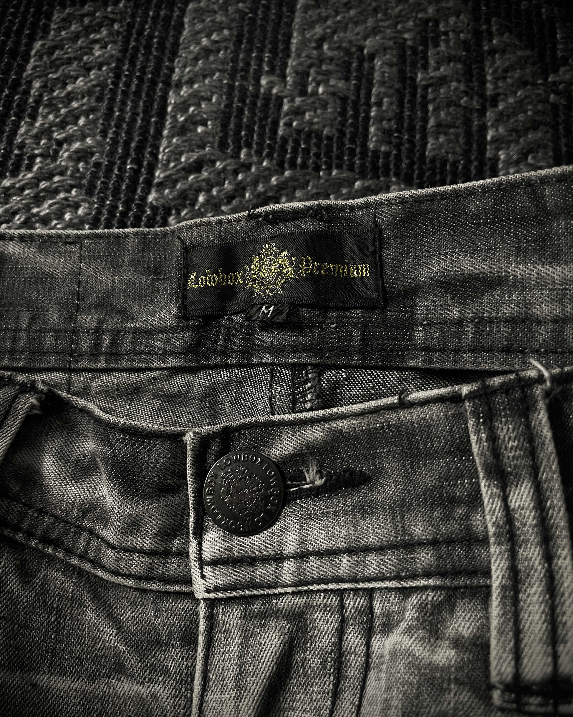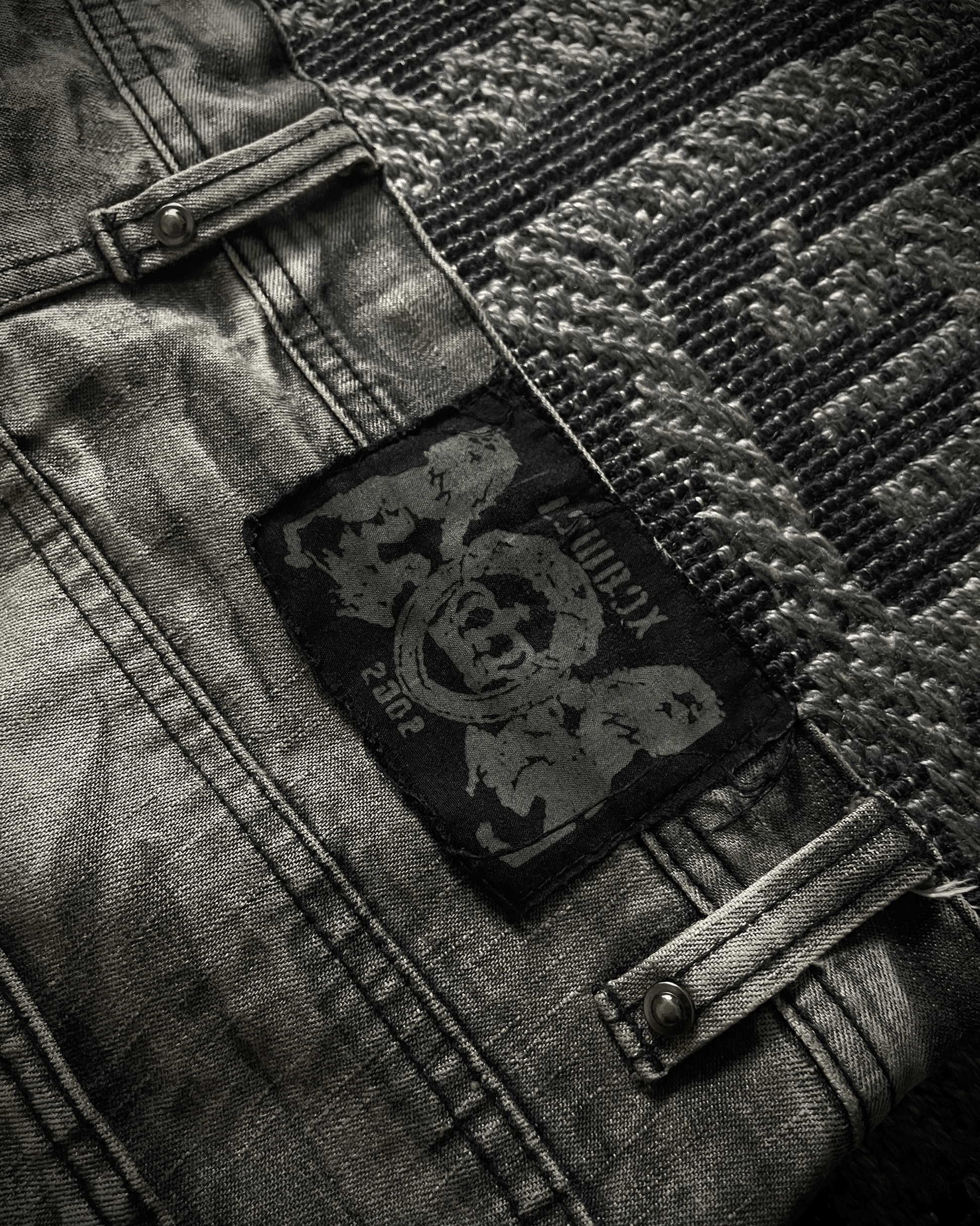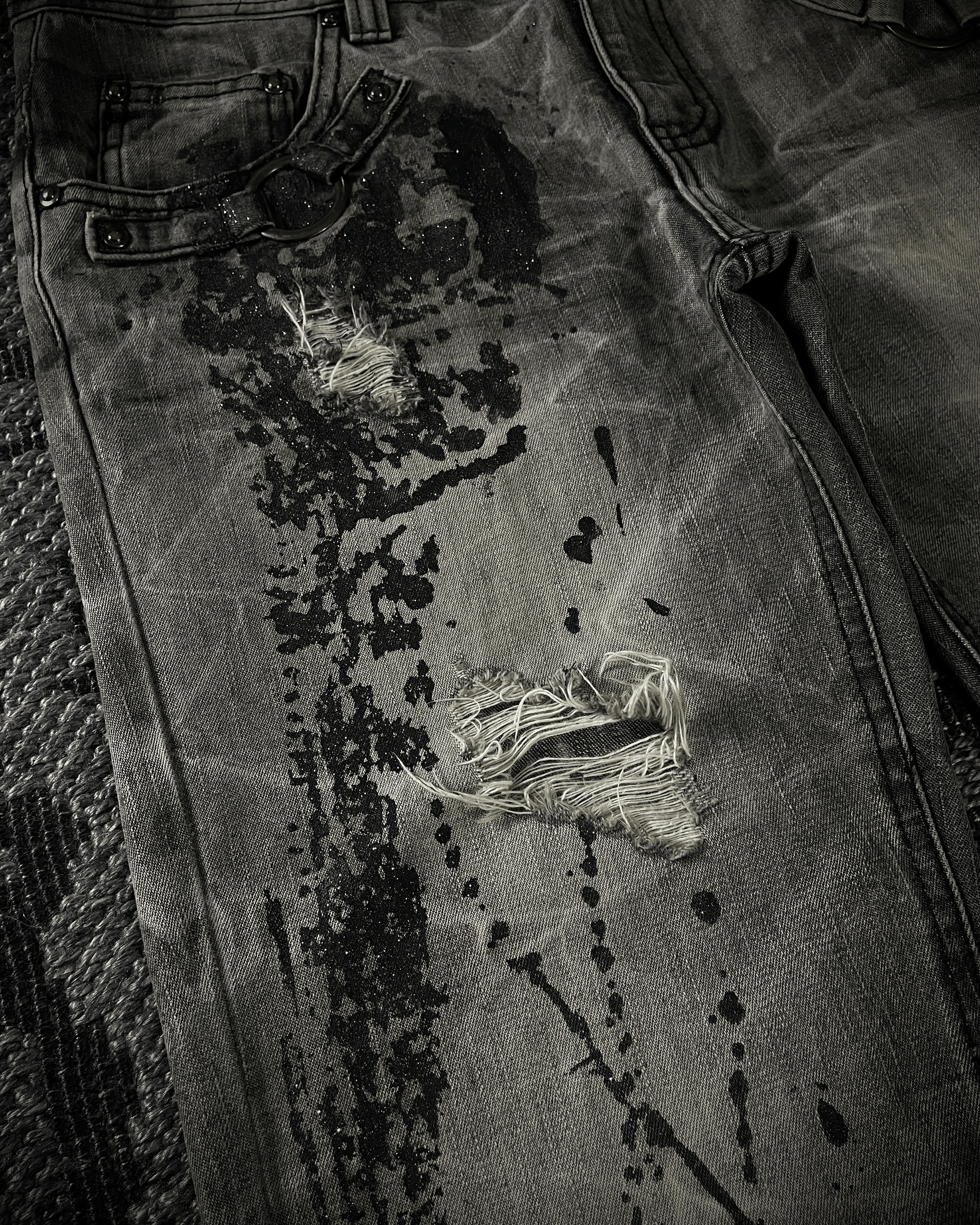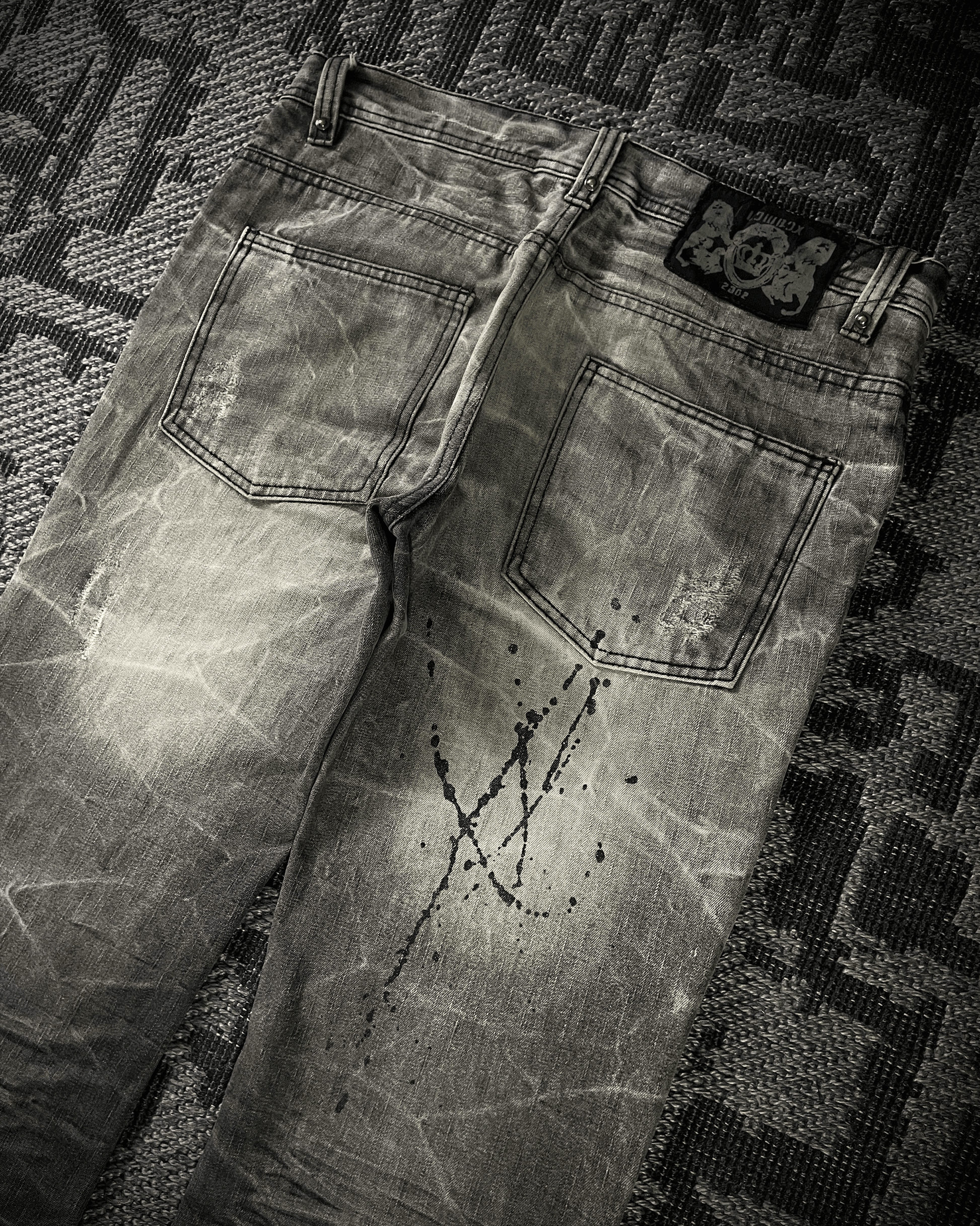 Lowbox denim jeans featuring black paint splashes highlighted with glitter detailing, creating a bold contrast against the acid-wash base. Finished with deliberate distressing and cut in a fitted bootcut silhouette, embodying a raw yet refined underground aesthetic.
