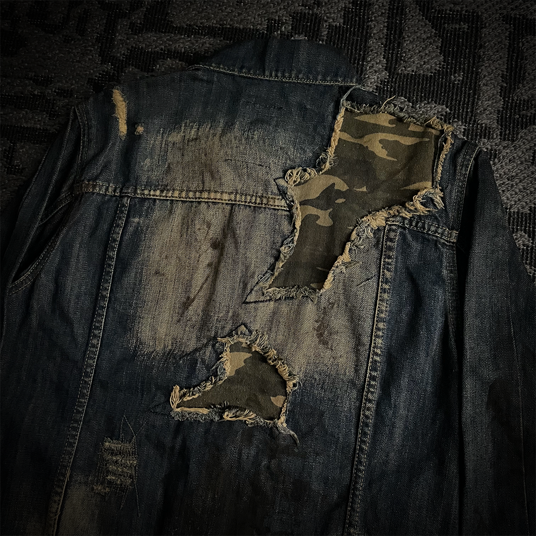 This is Midas jeans jacket with camouflage patches and distressed, worn look. It's a really sick denim jacket.