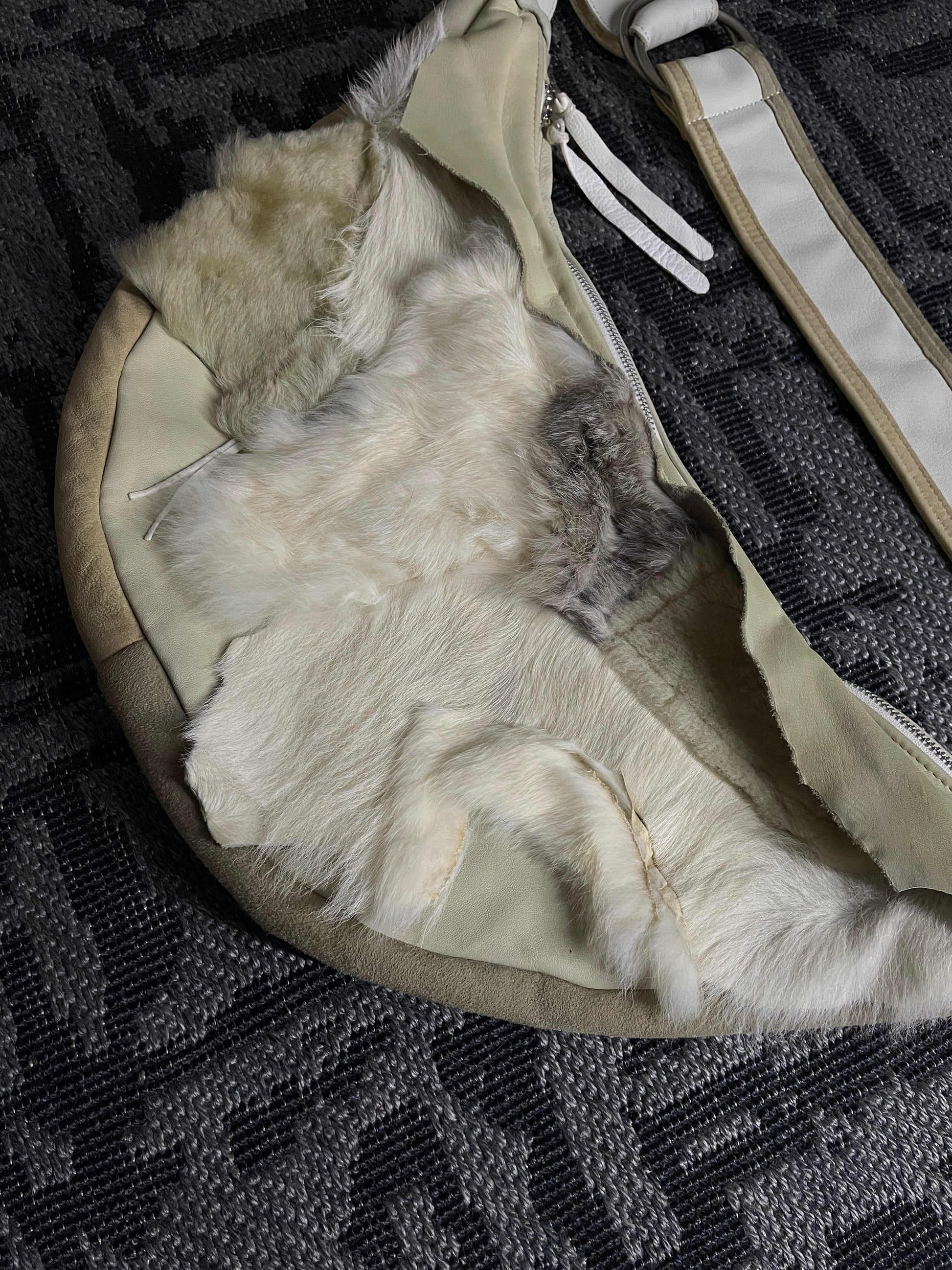 The exterior has two zip compartments: one hidden under the fur panel and the other as the main top zipper. Inside, there are four small compartments for organized storage.