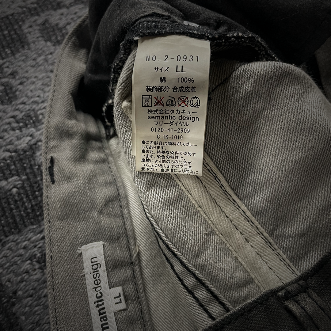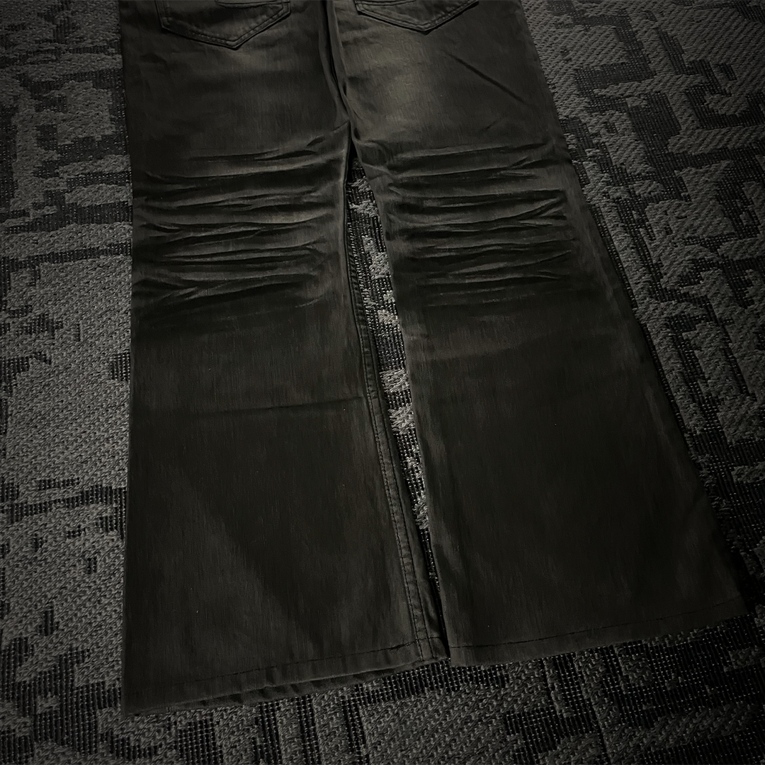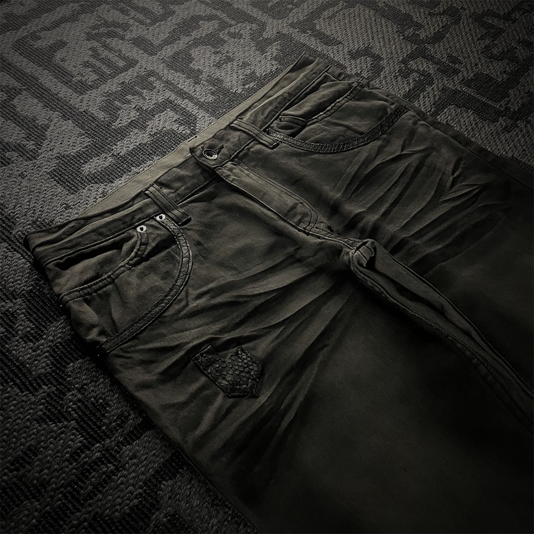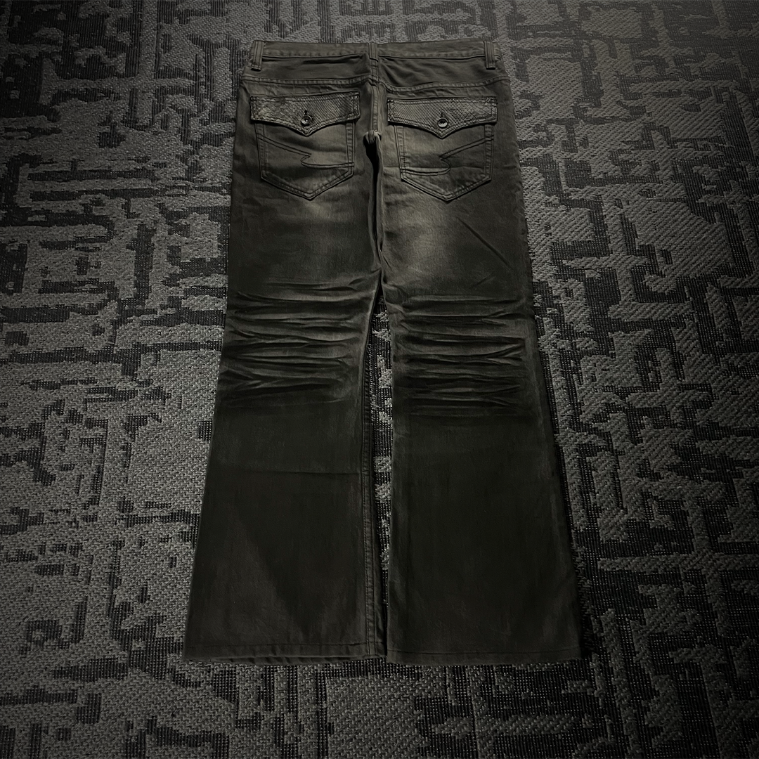 These semantic design jeans have a classic flared shape. The pocket edges look and feel like real python leather. The color of the pants is in a gray-black tone, giving a villainous feel.