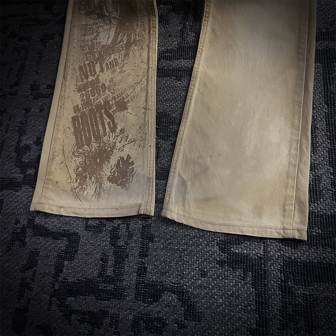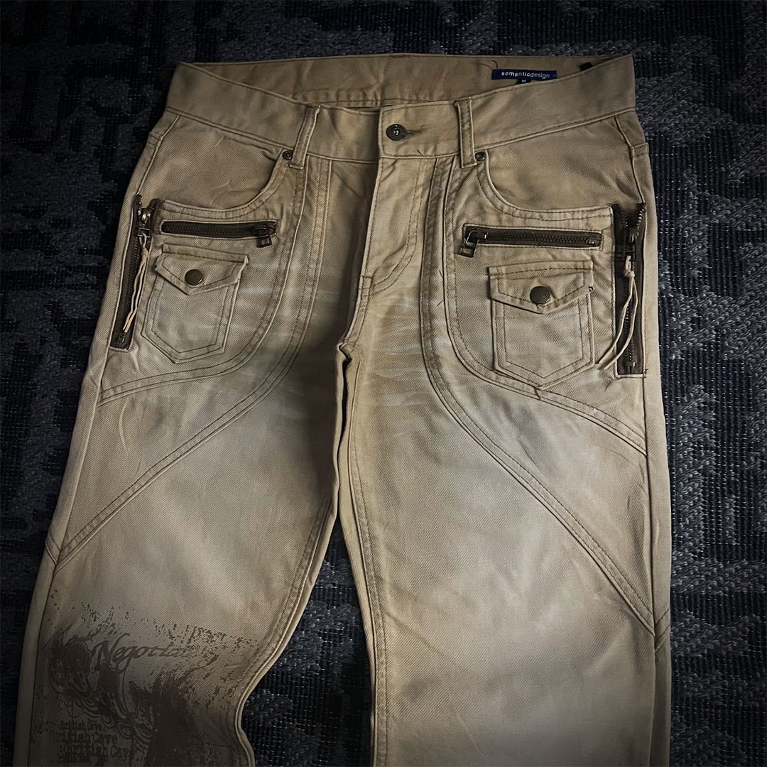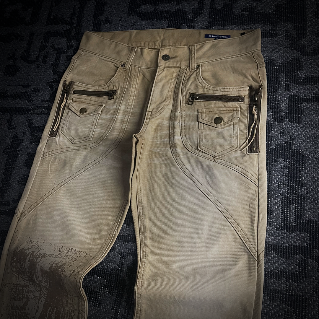 This pair is Semantic design, multiple zippers and pockets, and a unique tailoring, with beautiful printed graphics.