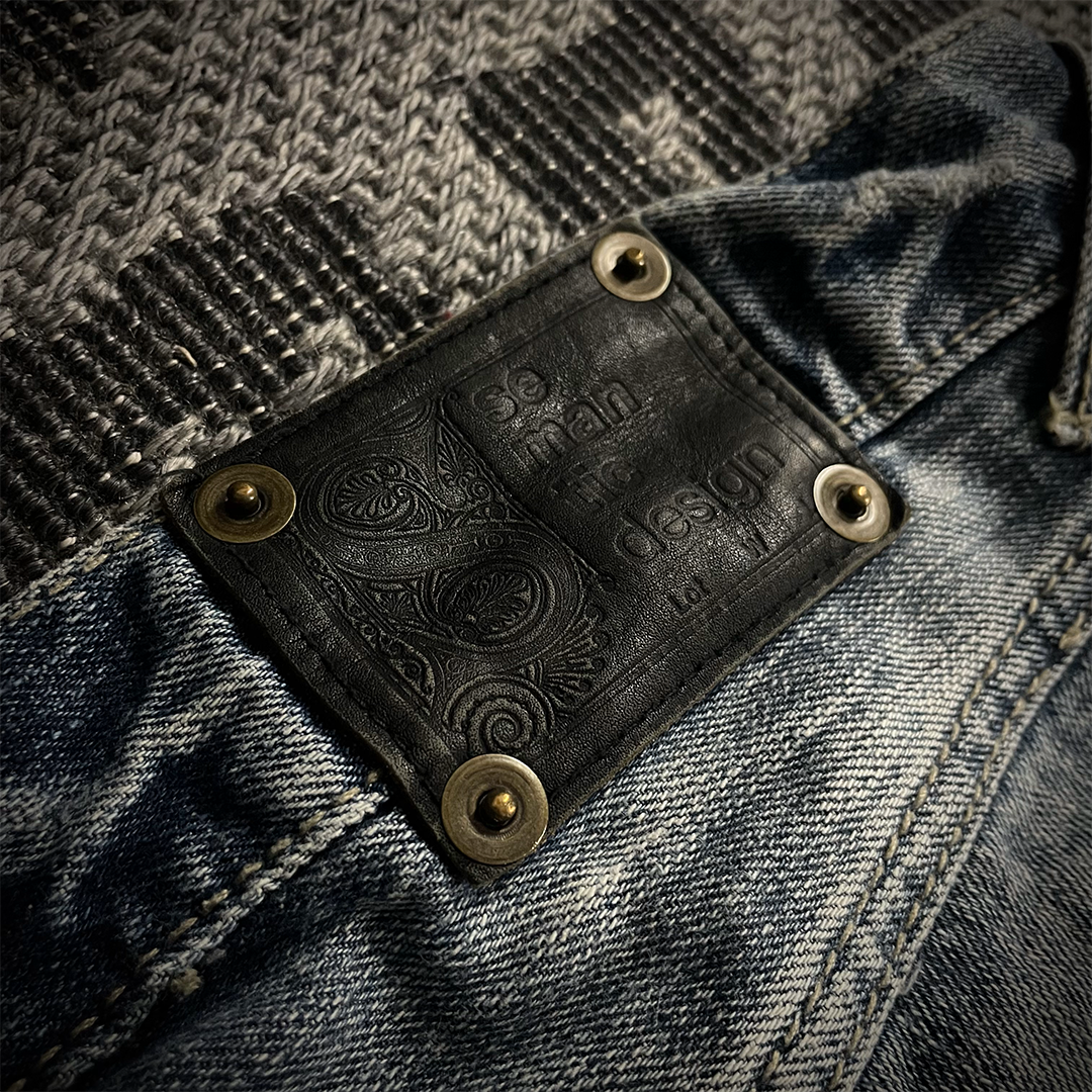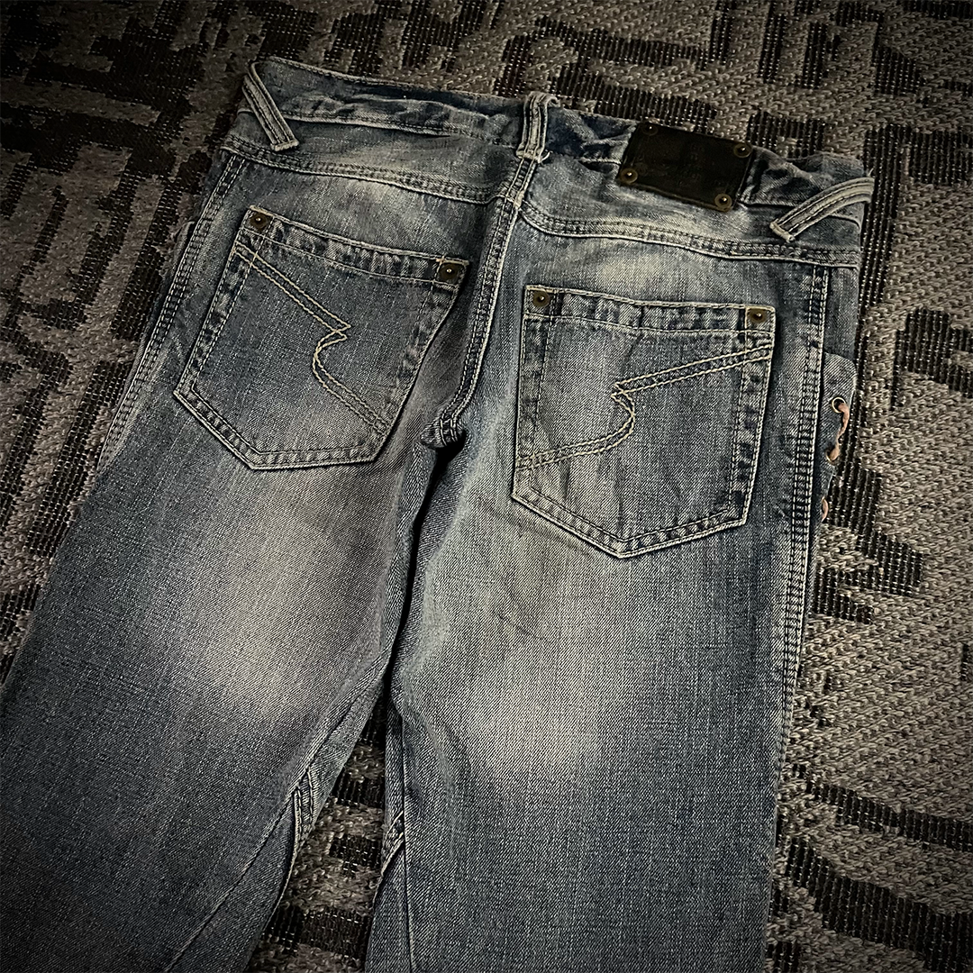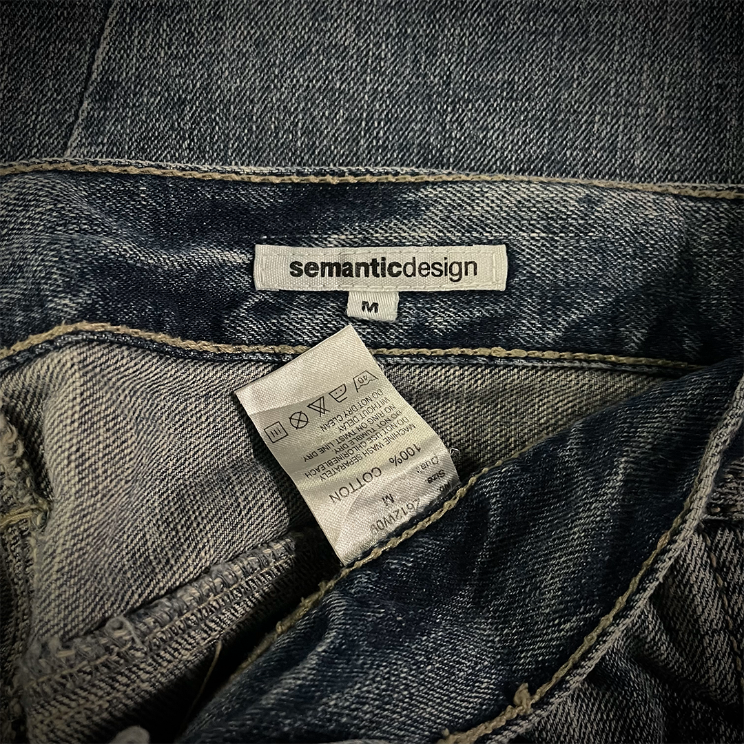 These jeans from Semantic Design feature lace-up detailing from the thigh to the knee, a spiral flared cut, and a ripped design that adds style and wearability.
