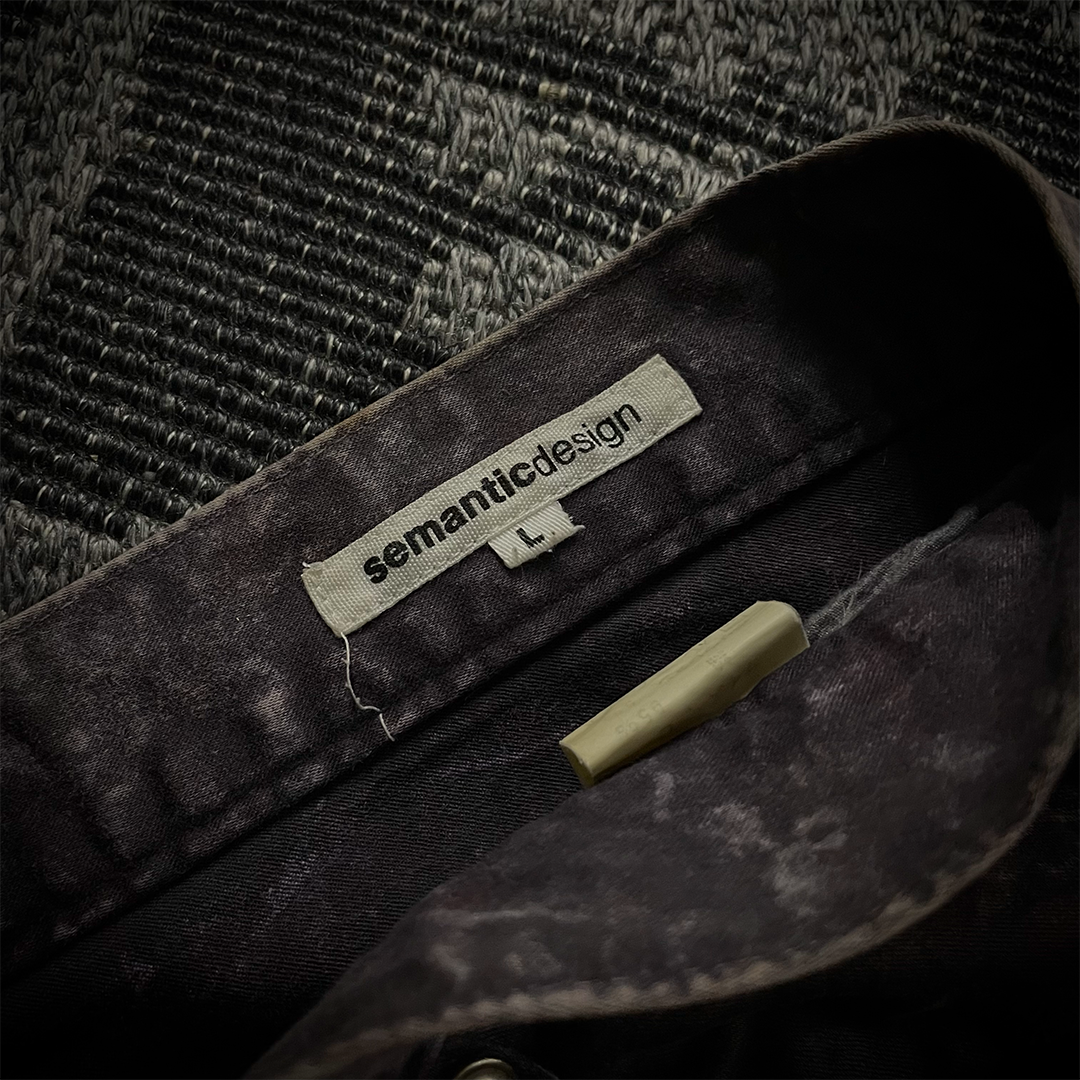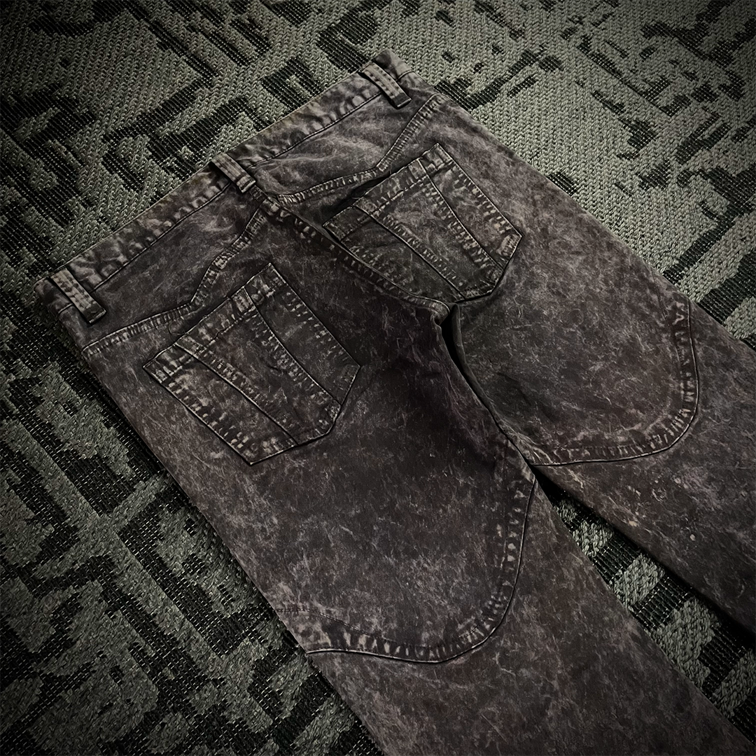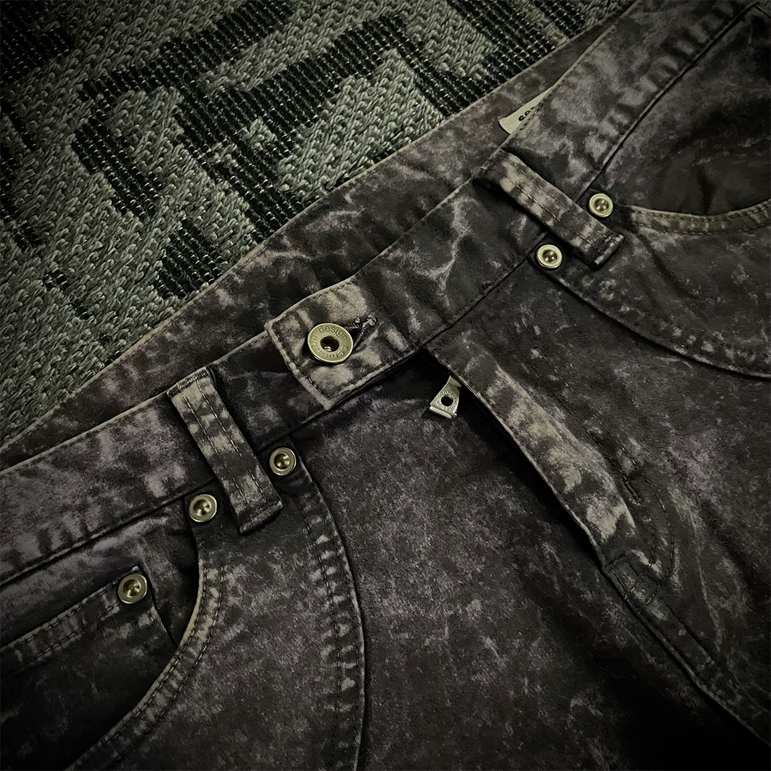 These Semantic Design jeans feature a striking purple tie-dye pattern, expert tailoring, and the brand’s signature zipper detail at the crotch.