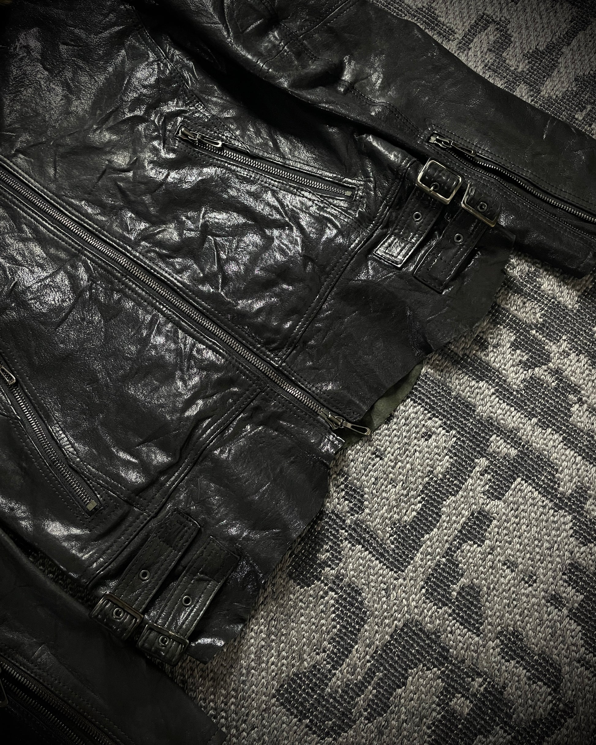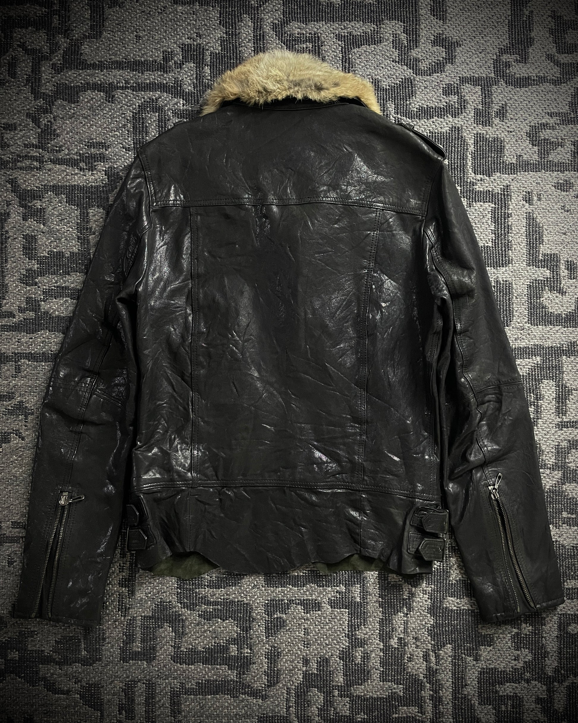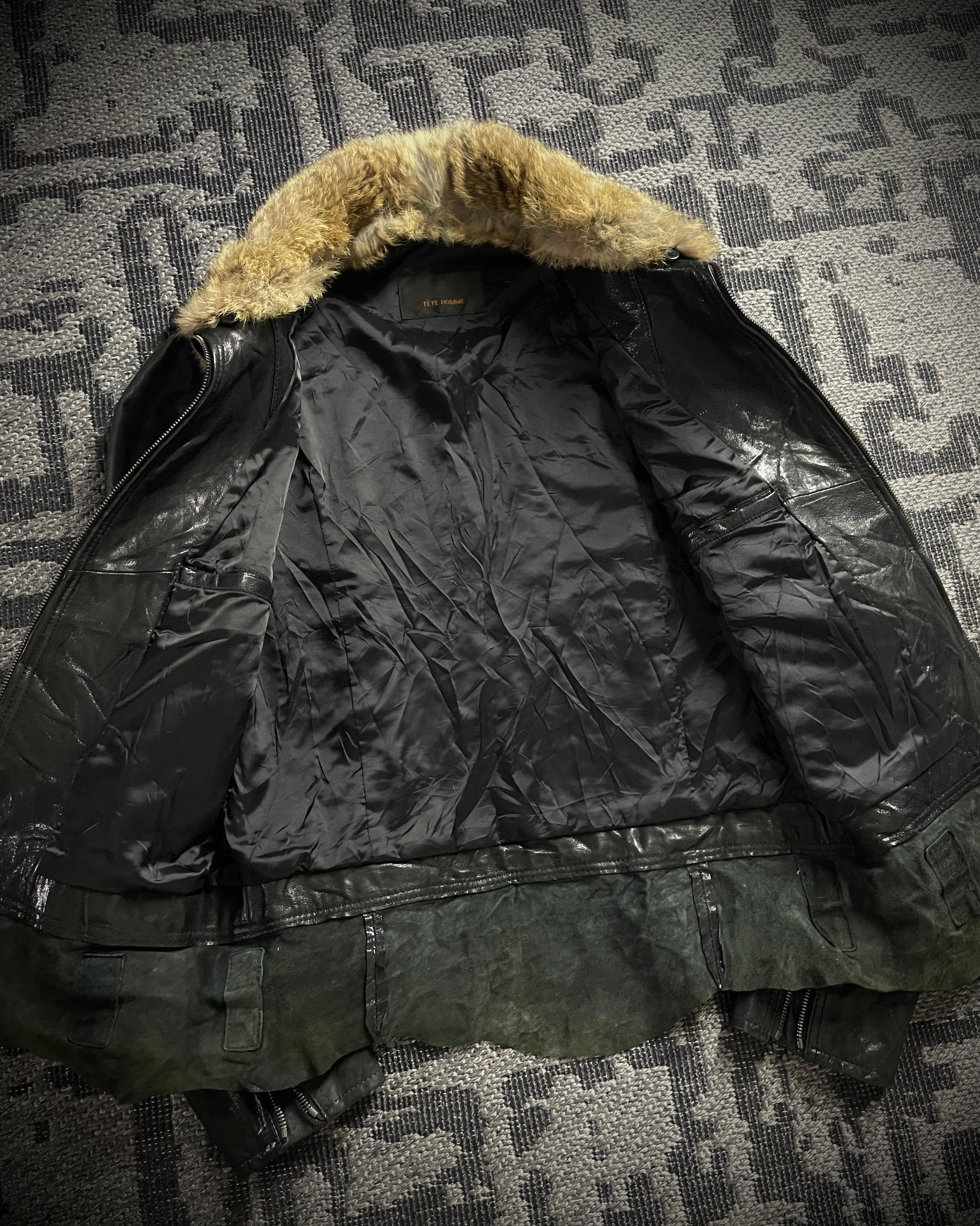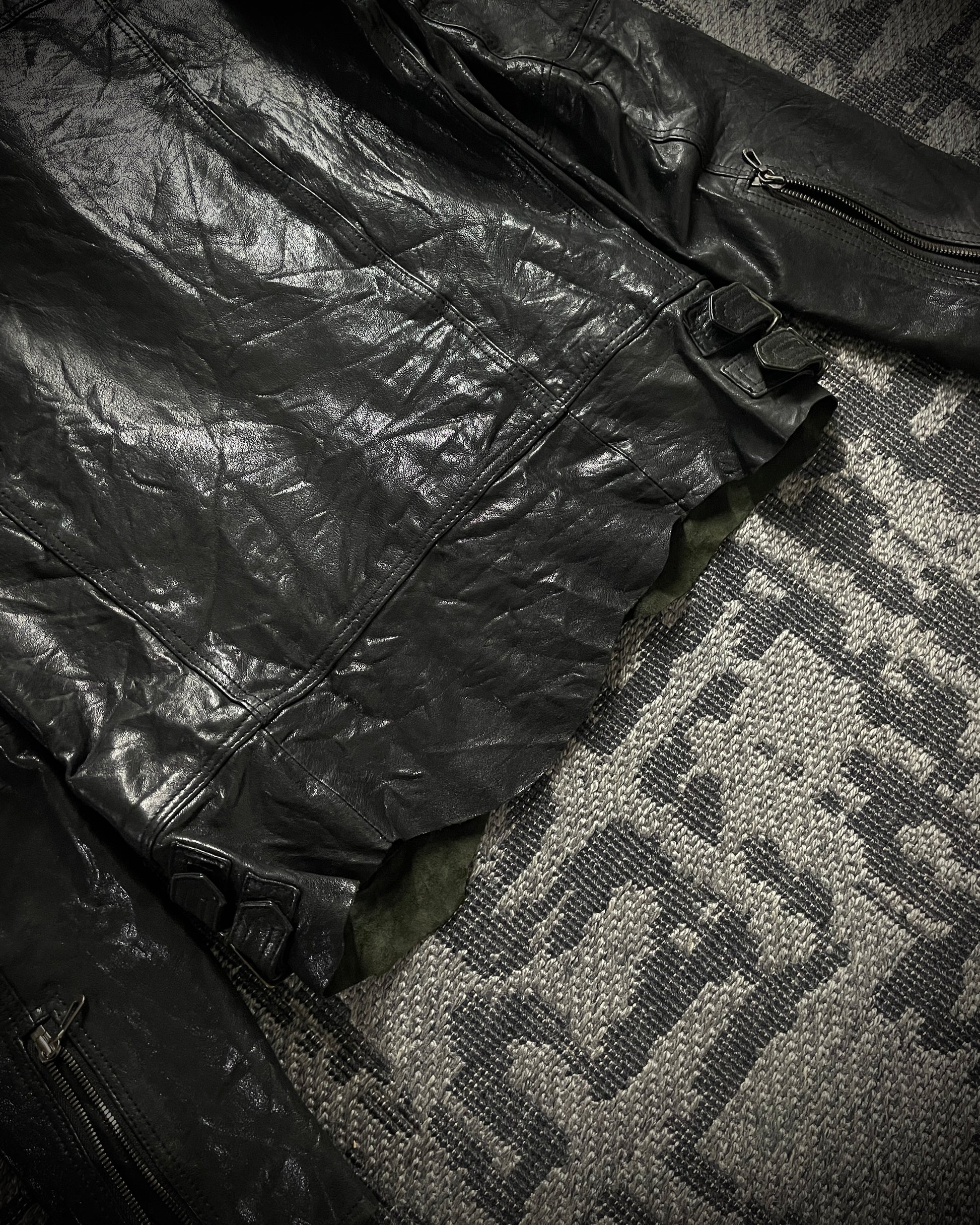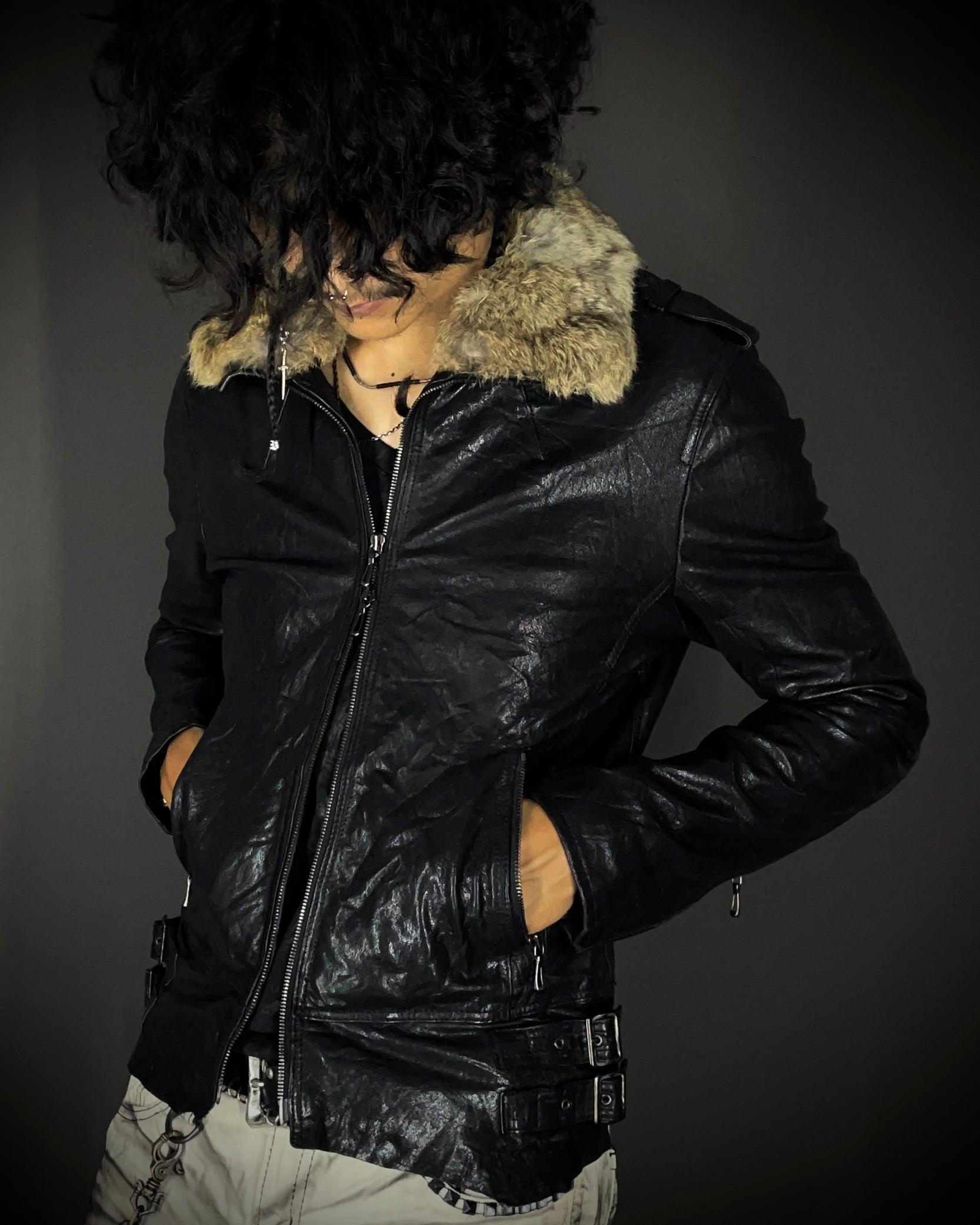 Tete Homme shearling leather jacket featuring rabbit fur accents and a mix of Excella & YKK zippers. Designed with an asymmetrical curved hem and dual buckle straps on each side. The leather displays natural creasing and subtly matte areas in select regions, adding depth and a distinctive textured character.