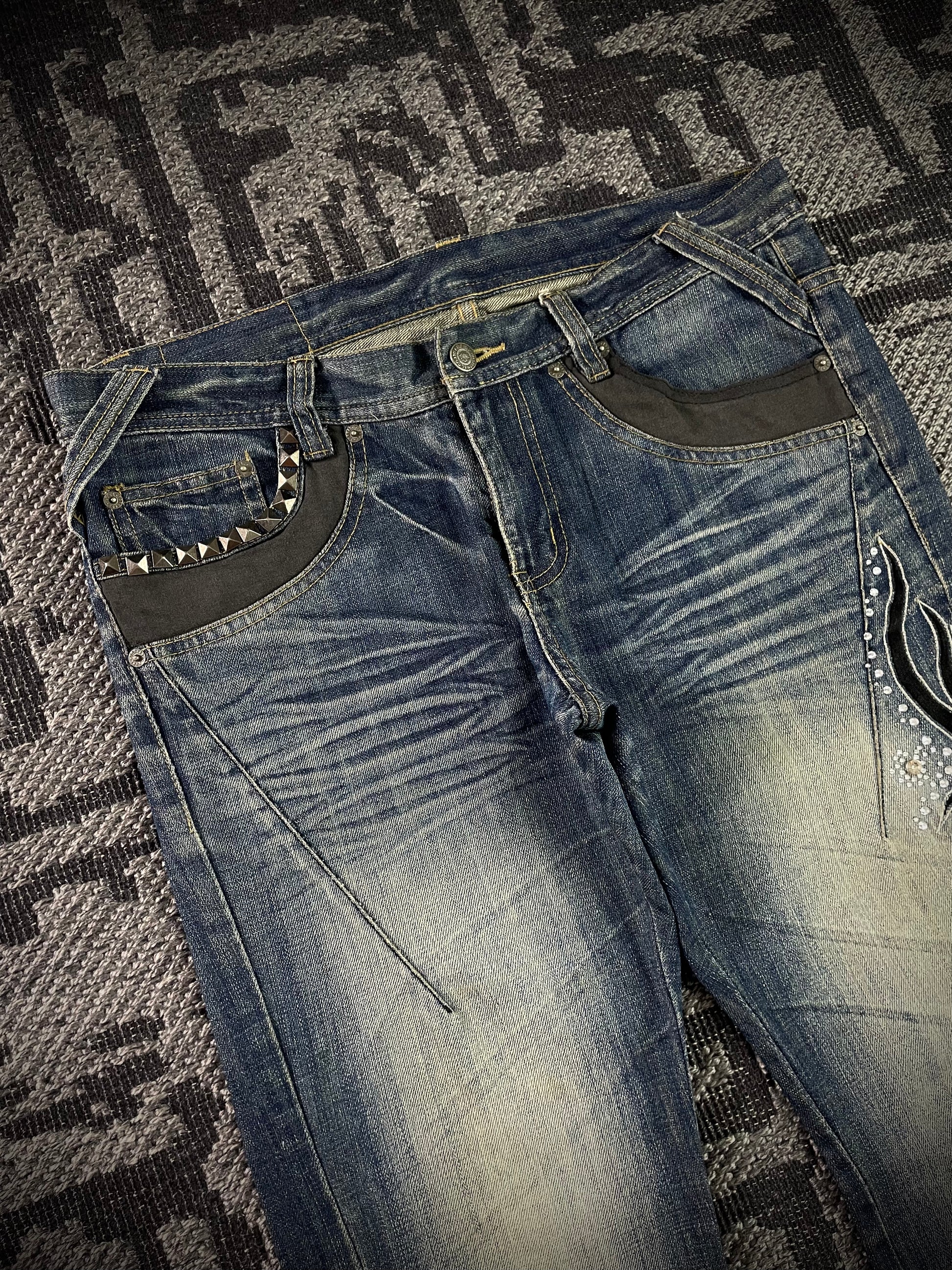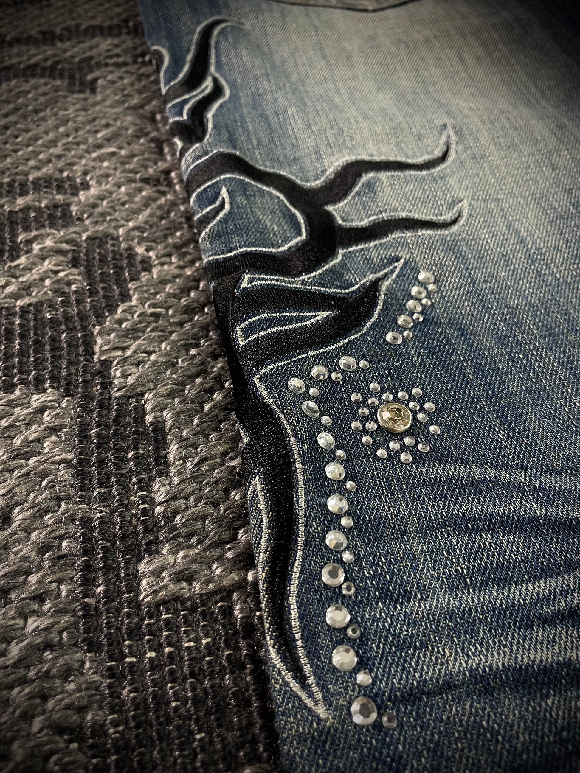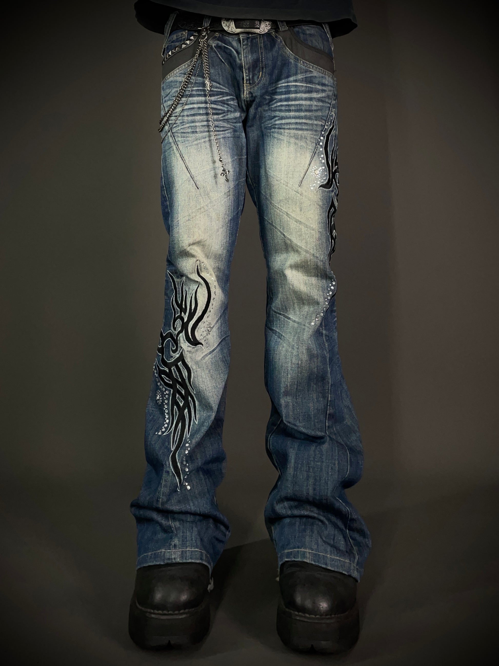 These flared blue denim pants from Tornado Mart, a Japanese brand known for its bold and unique designs, feature tribal embroidery and are accented with white gemstones and silver-colored studs. Made from denim with distinctive fading, they are full of character.