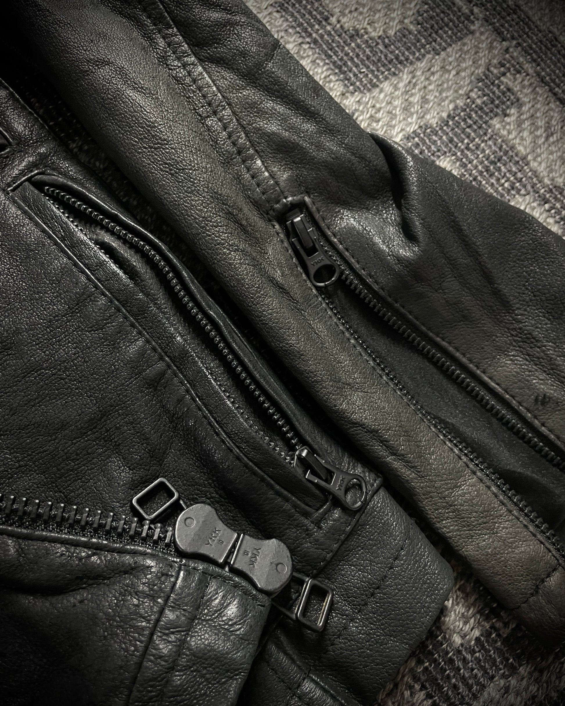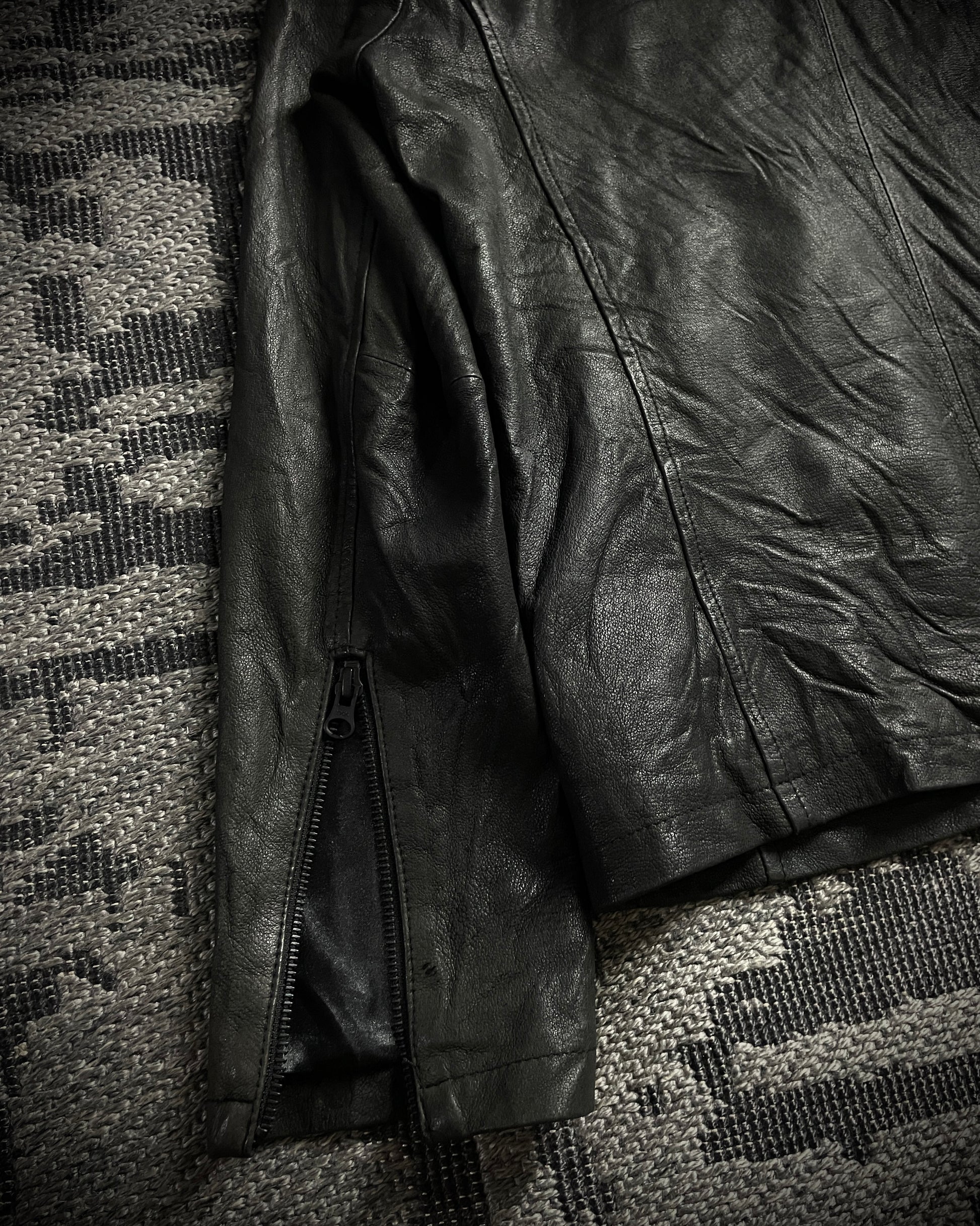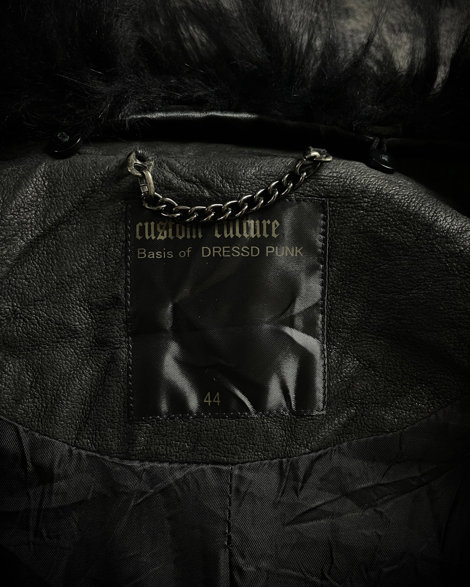 This is a Custom Culture jacket crafted from soft pig leather with natural creases and subtle fading, adorned with long, soft black real fur. The jacket features asymmetrical pockets of varying sizes with black-coated zippers, blending leather and fur to create a raw, grounded piece with distinctive and striking details.